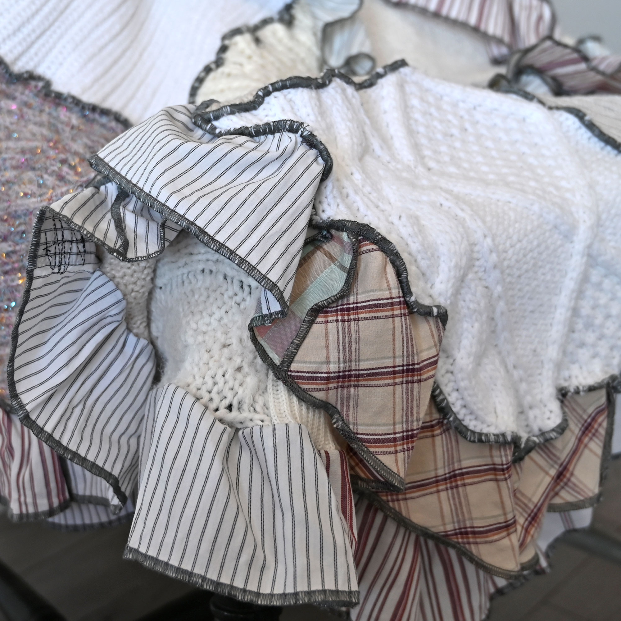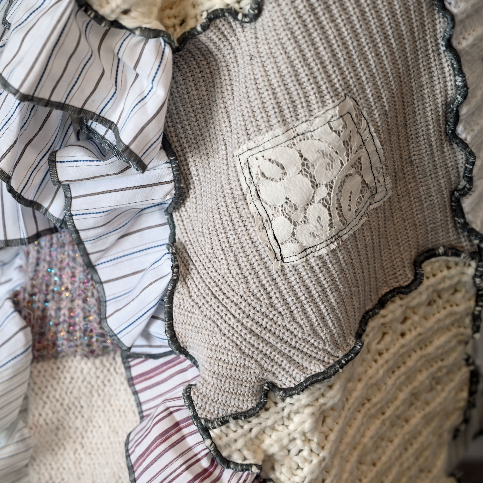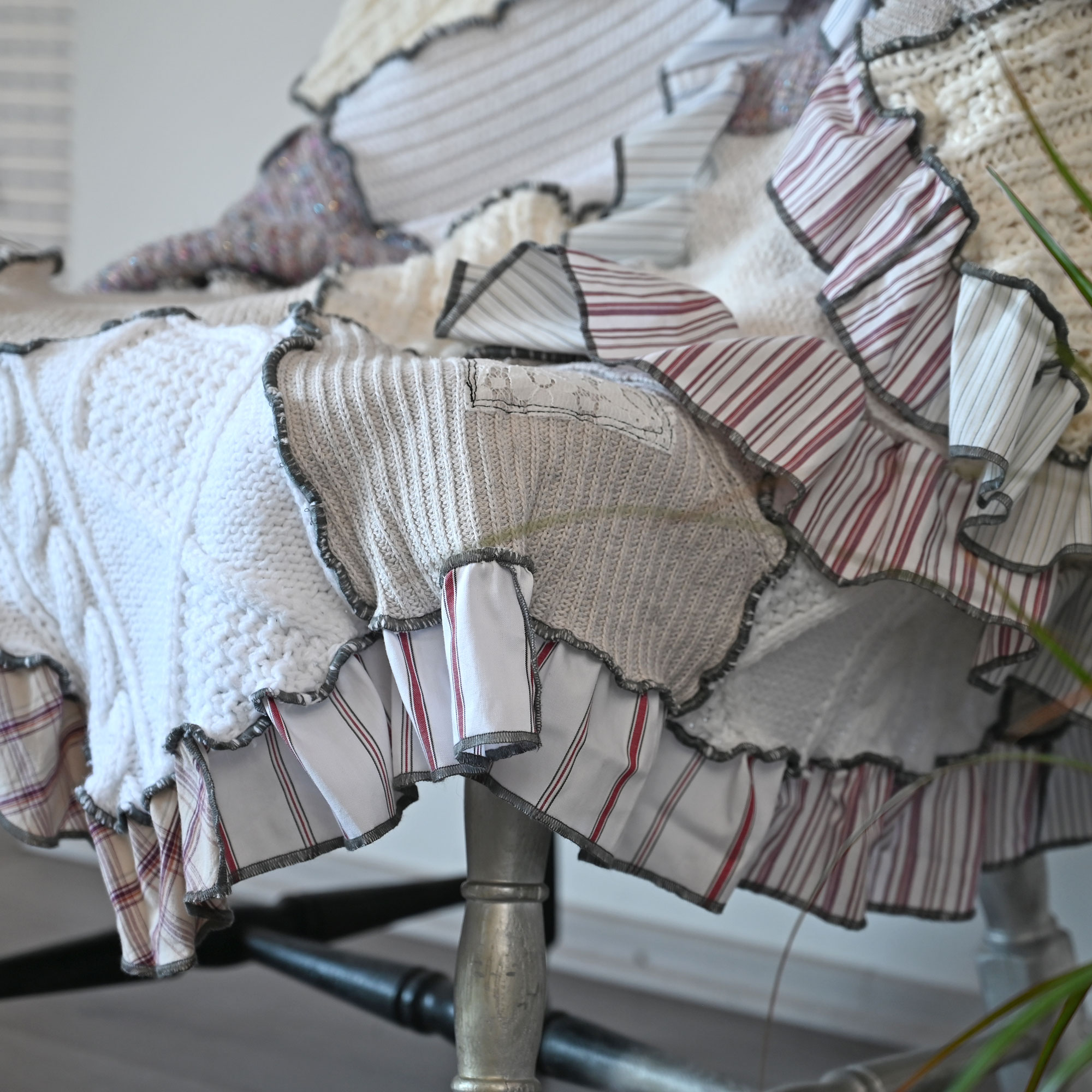 Dekica od recikliranih pletiva, obrubljena volanom od pamučnih košulja (također recikliranih). Dimenzije oko 135 x 185 cm, idealno za utopljavanje na kauču, a kako je ova rastezljiva, može se koristiti i za prekrivanje kreveta za jednu osobu.