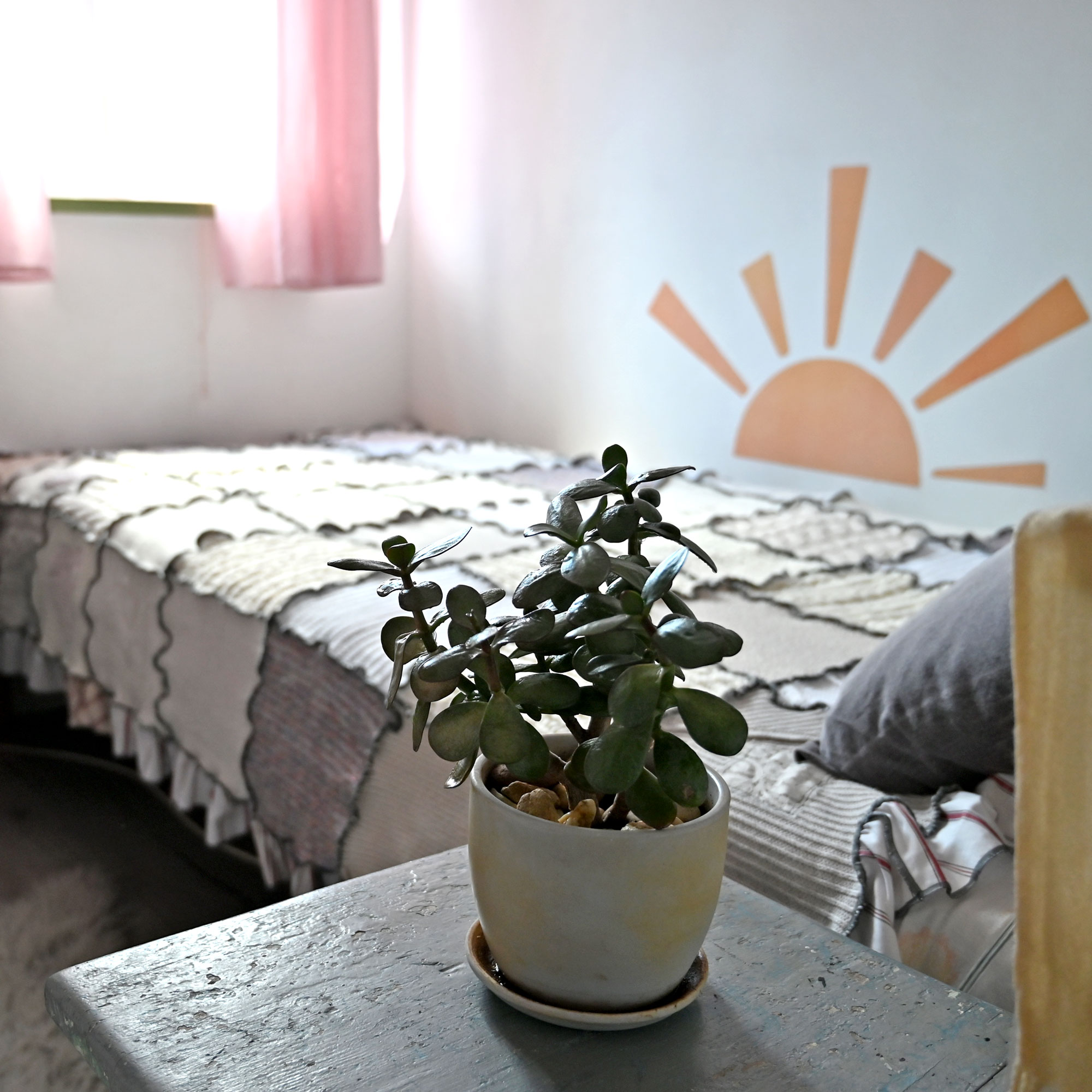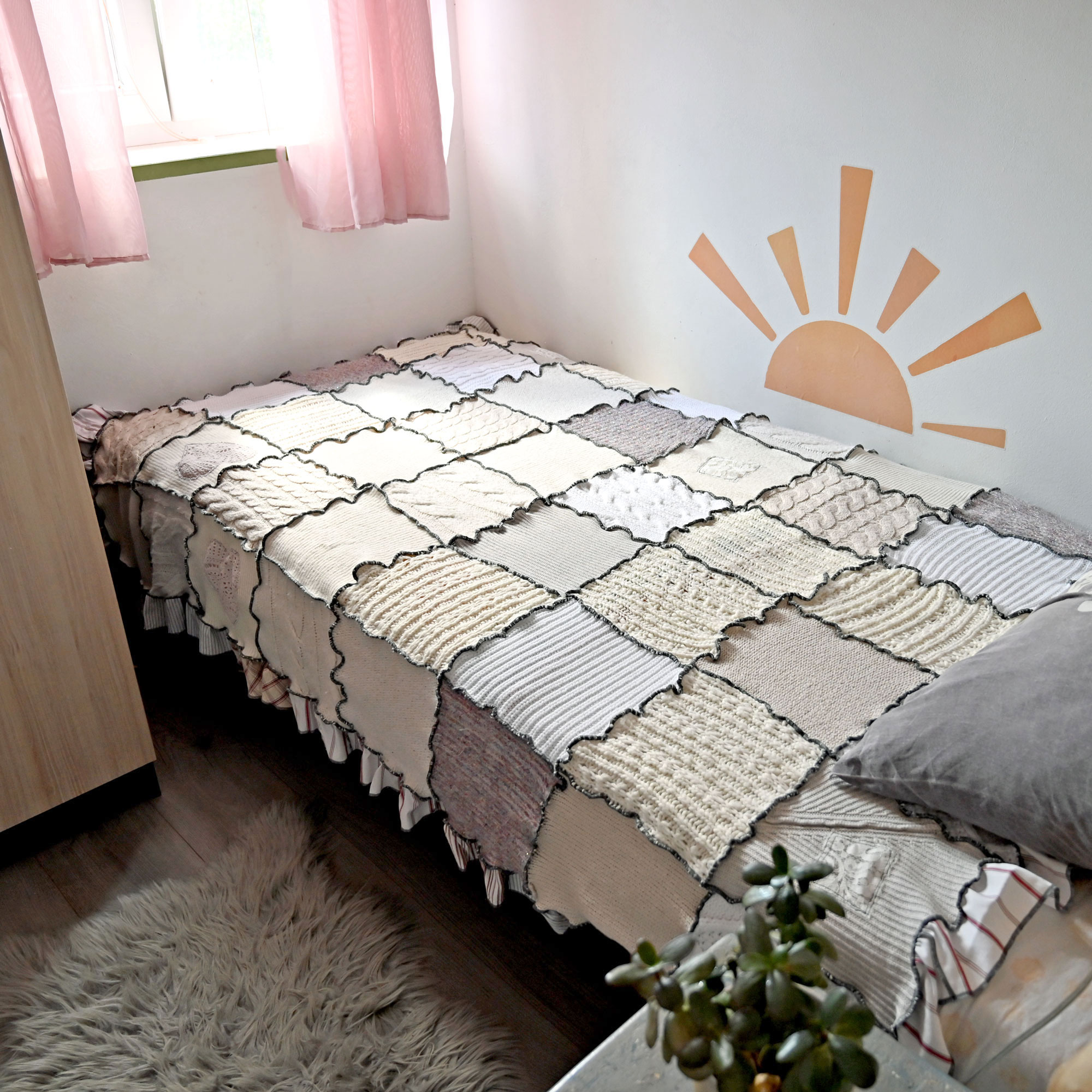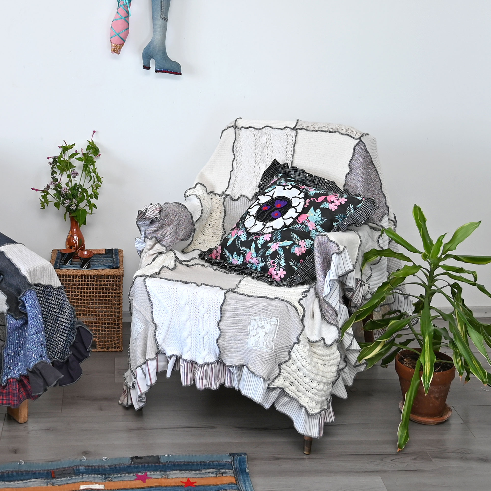 Dekica od recikliranih pletiva, obrubljena volanom od pamučnih košulja (također recikliranih). Dimenzije oko 135 x 185 cm, idealno za utopljavanje na kauču, a kako je ova rastezljiva, može se koristiti i za prekrivanje kreveta za jednu osobu.