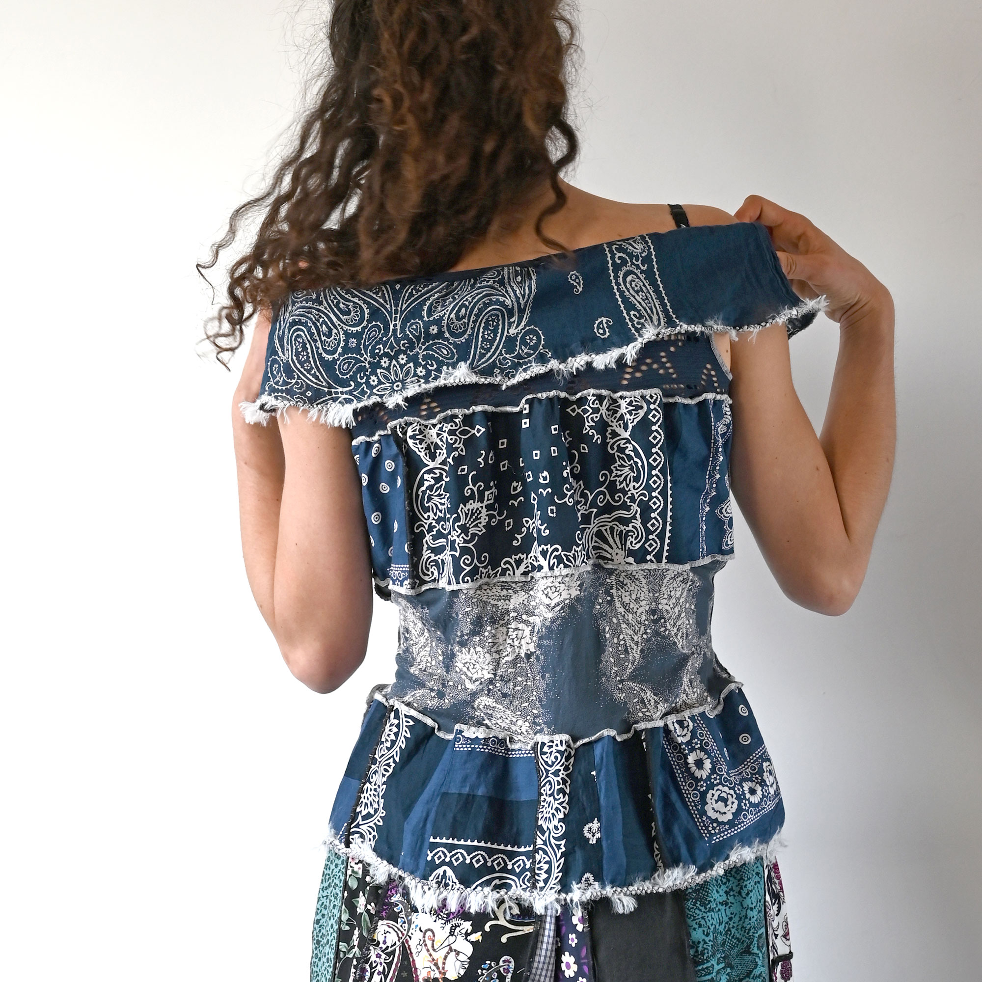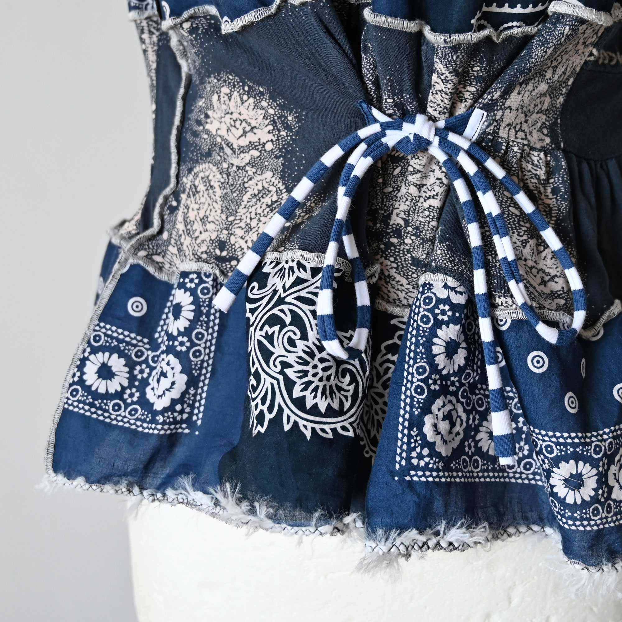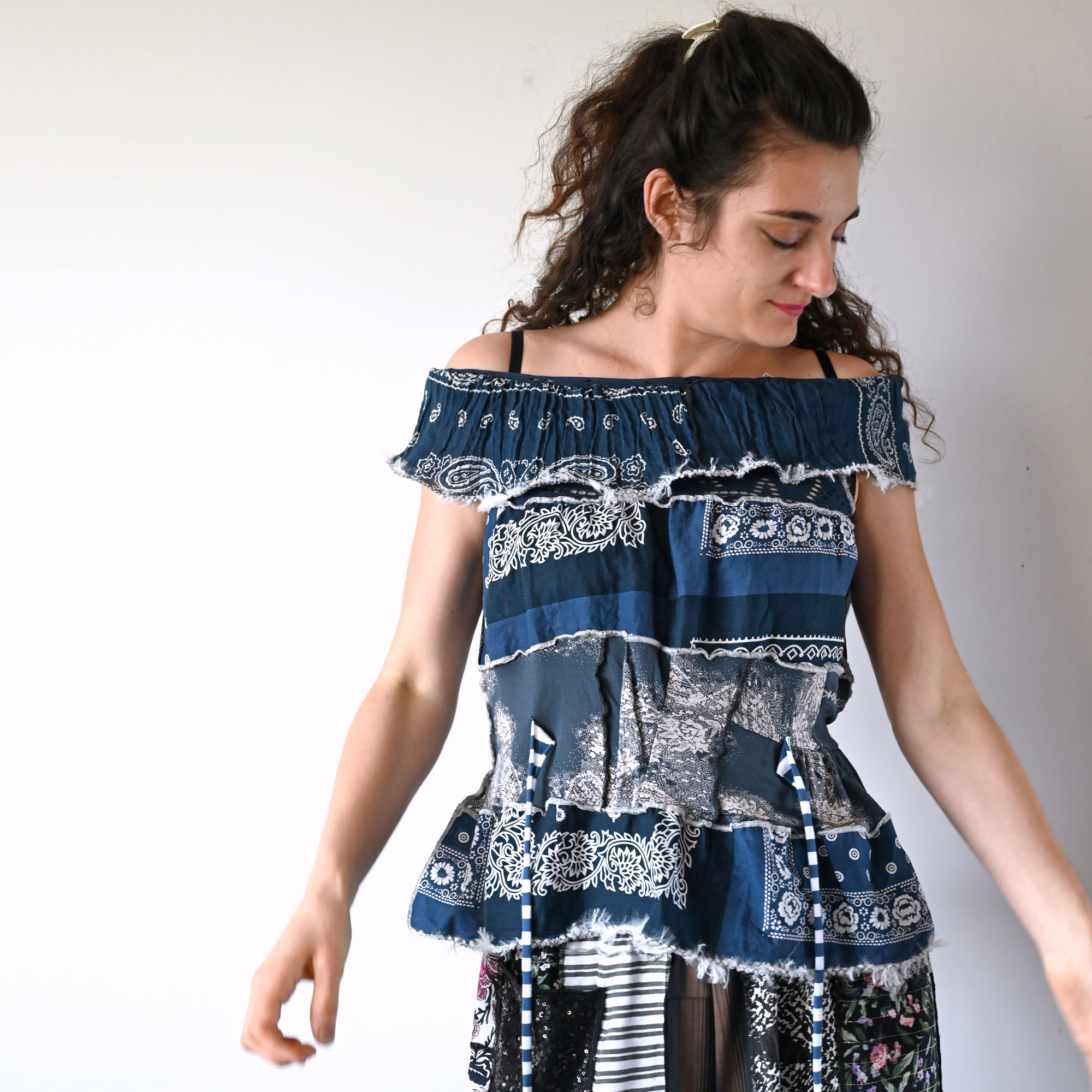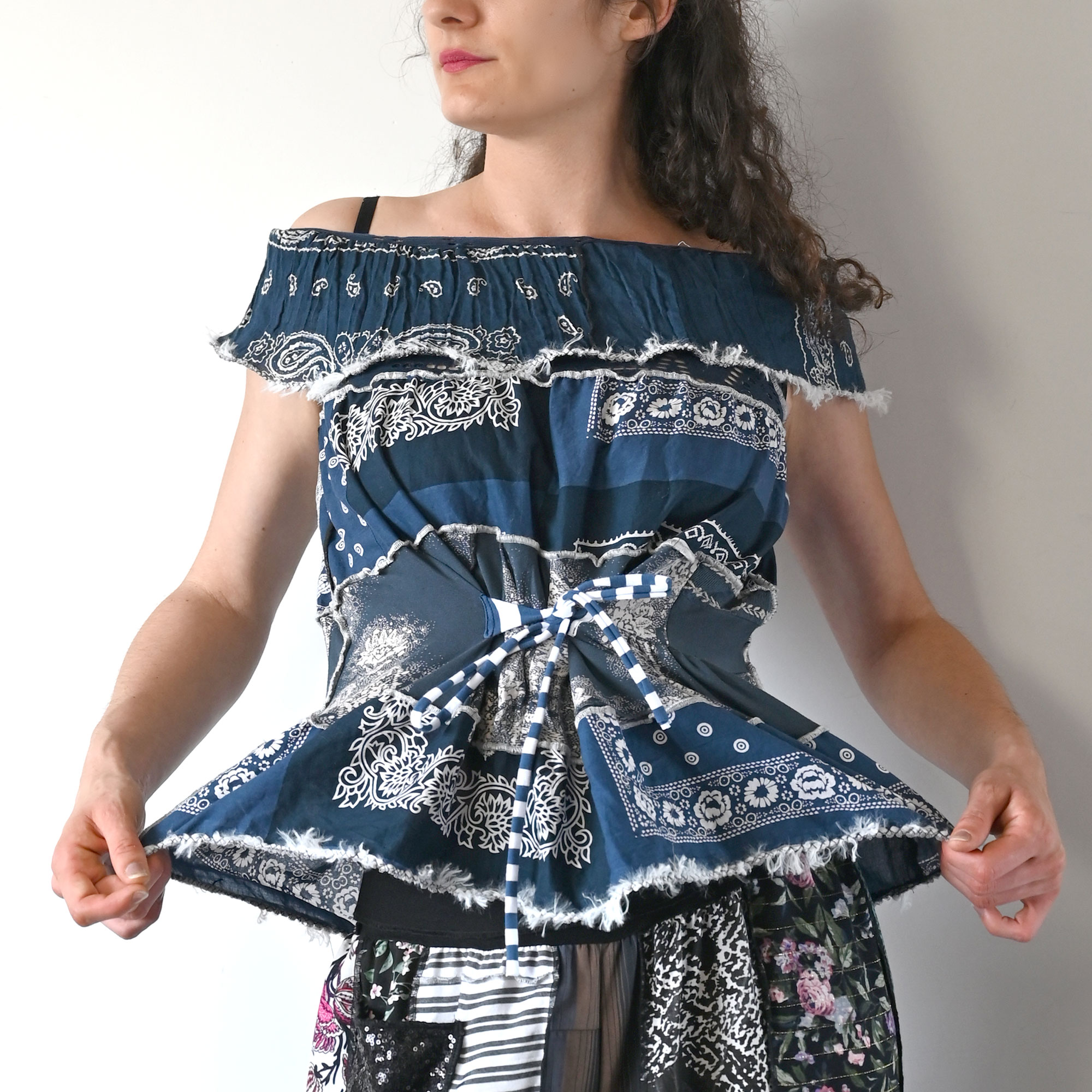 Prozračna reciklirana bluzica od pamučne tkanine i viskoznog žerseja s elastinom. Široki kroj, s duljim vezalicama koje možete vezati sprijeda ili straga. Blago spuštenih ramena. Dugačka oko 60 cm, mjereno od ramena, u raspuštenom obliku. Kad se veže, skrati se za 5-6 cm. Obrubi nestašno čupavi.