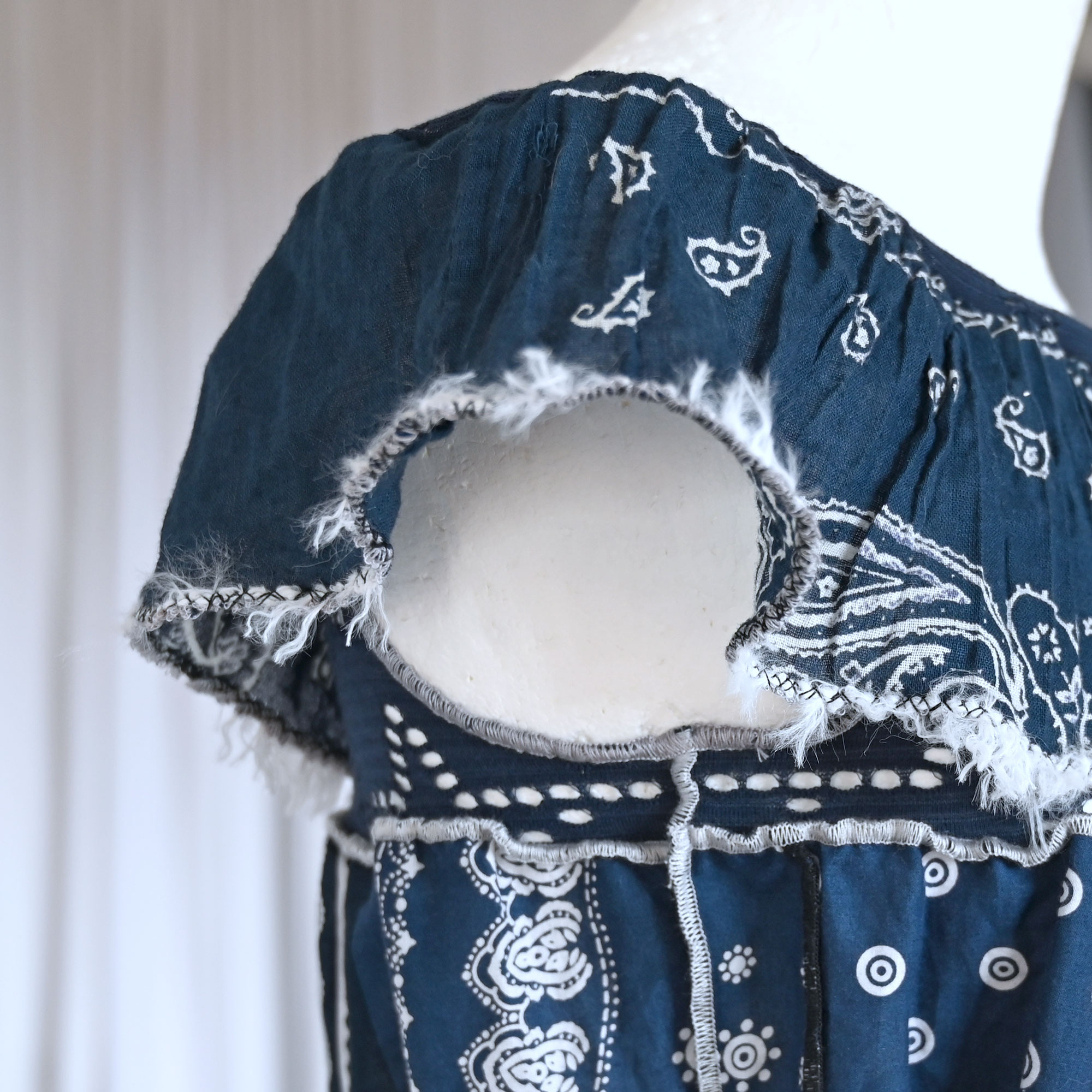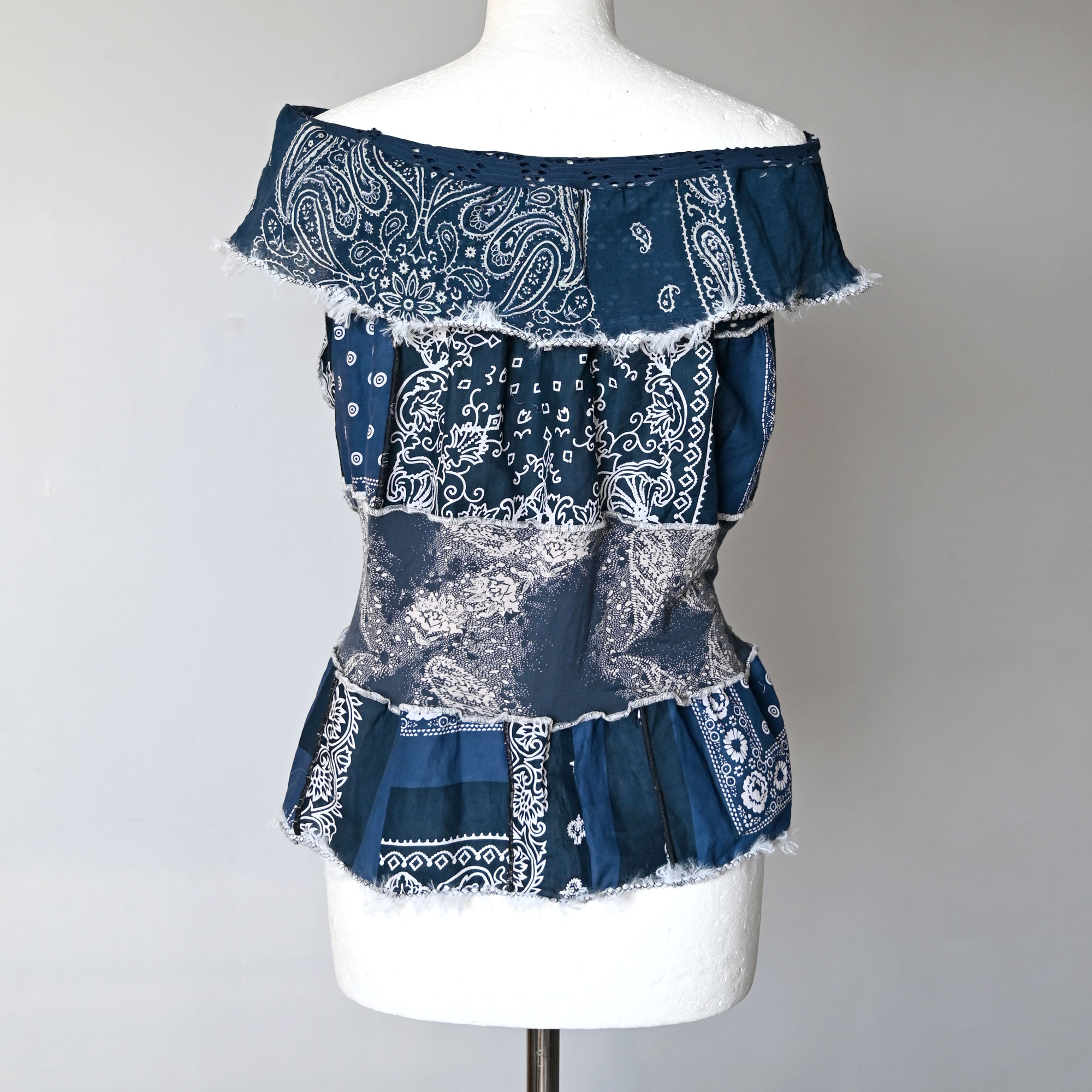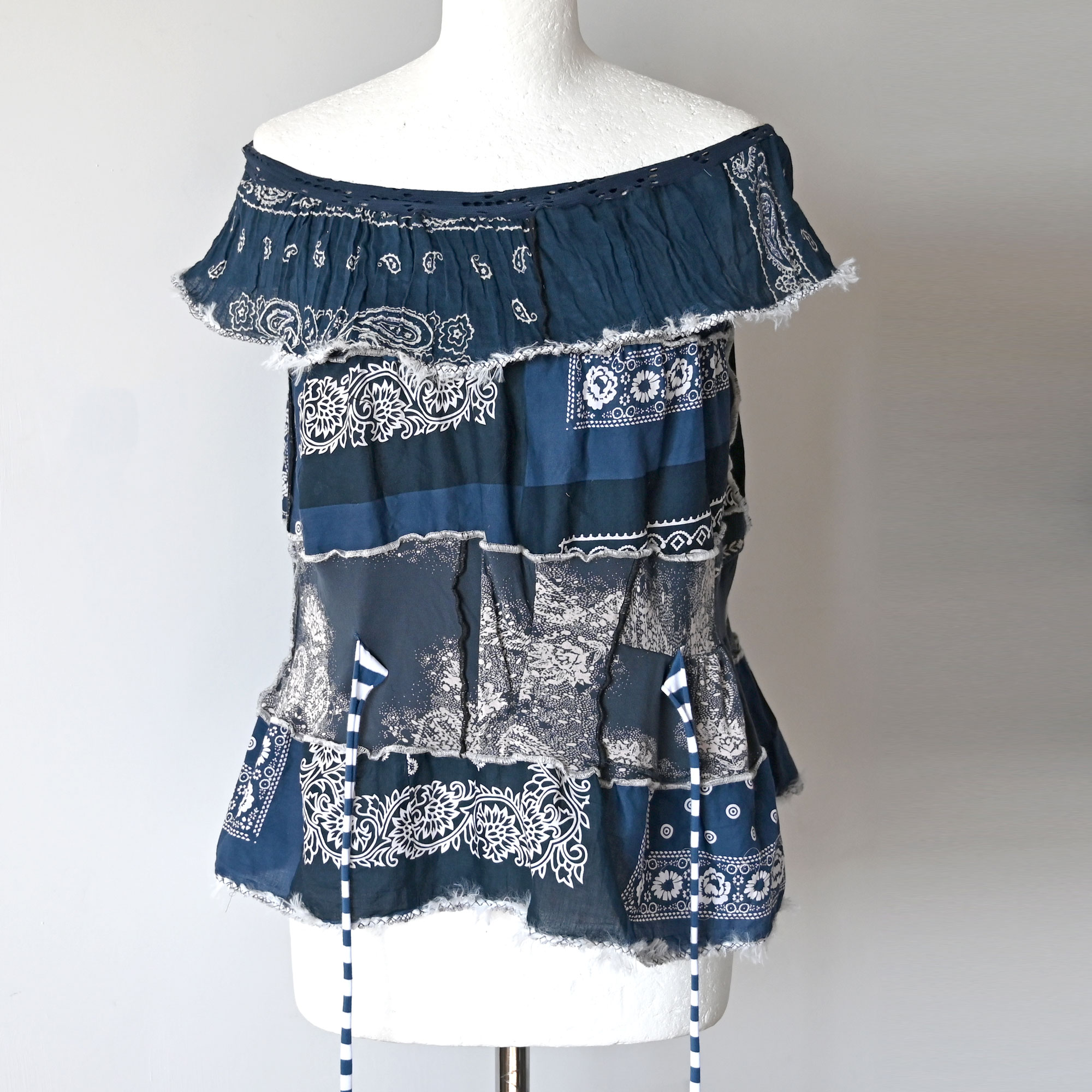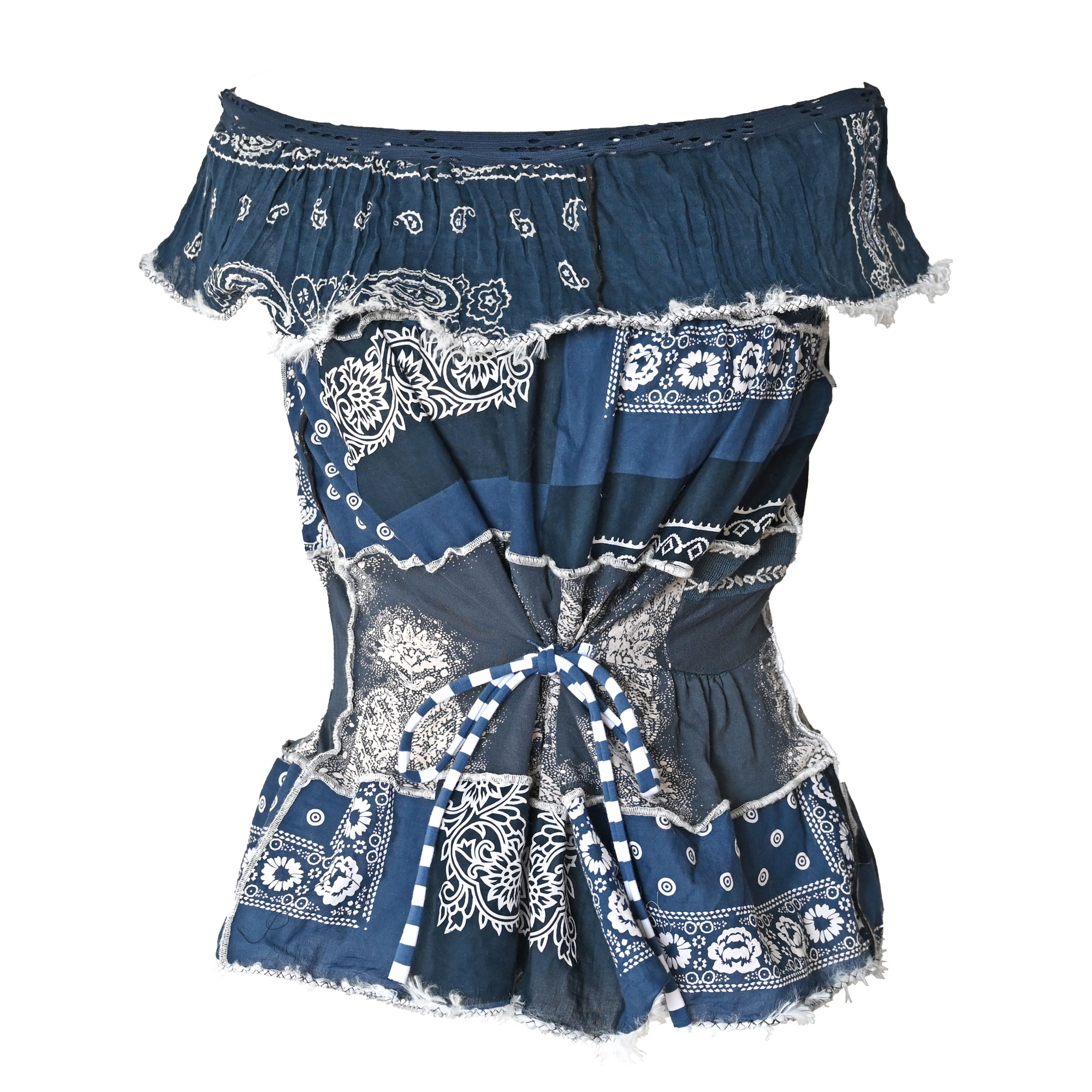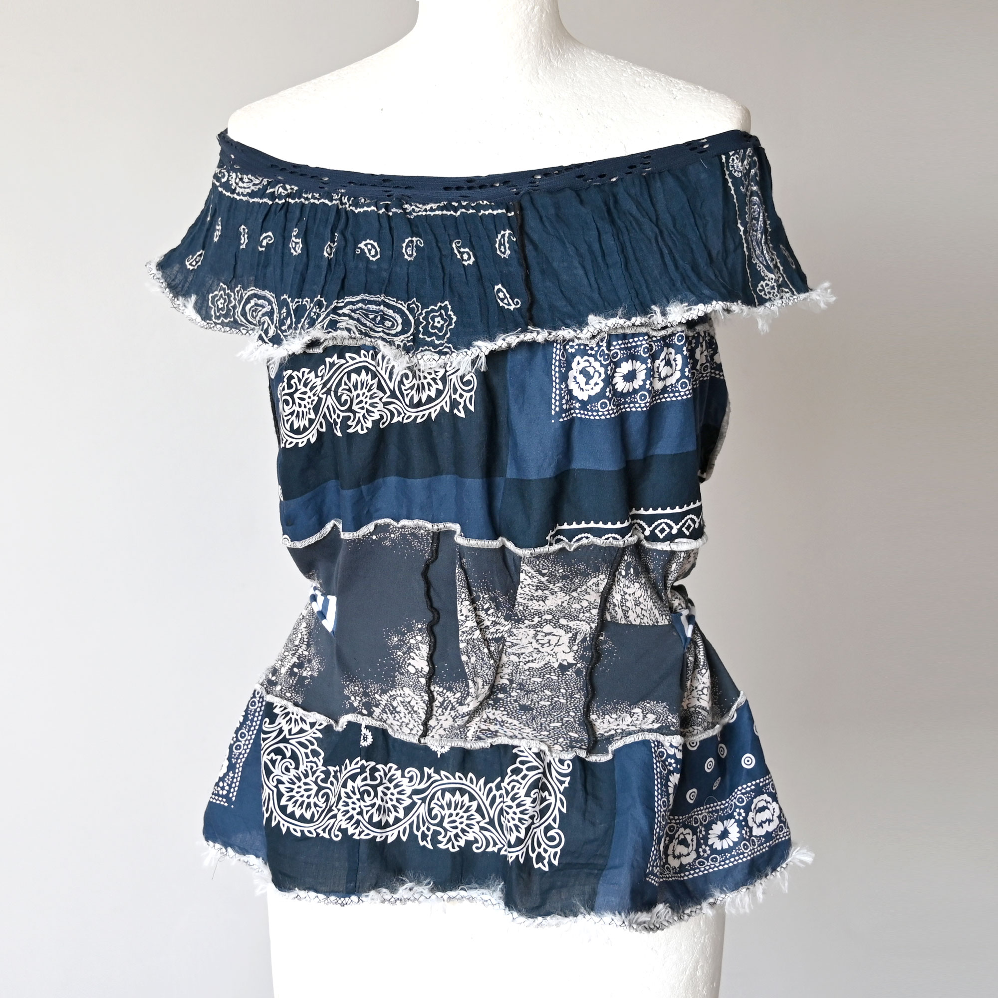 Prozračna reciklirana bluzica od pamučne tkanine i viskoznog žerseja s elastinom. Široki kroj, s duljim vezalicama koje možete vezati sprijeda ili straga. Blago spuštenih ramena. Dugačka oko 60 cm, mjereno od ramena, u raspuštenom obliku. Kad se veže, skrati se za 5-6 cm. Obrubi nestašno čupavi.