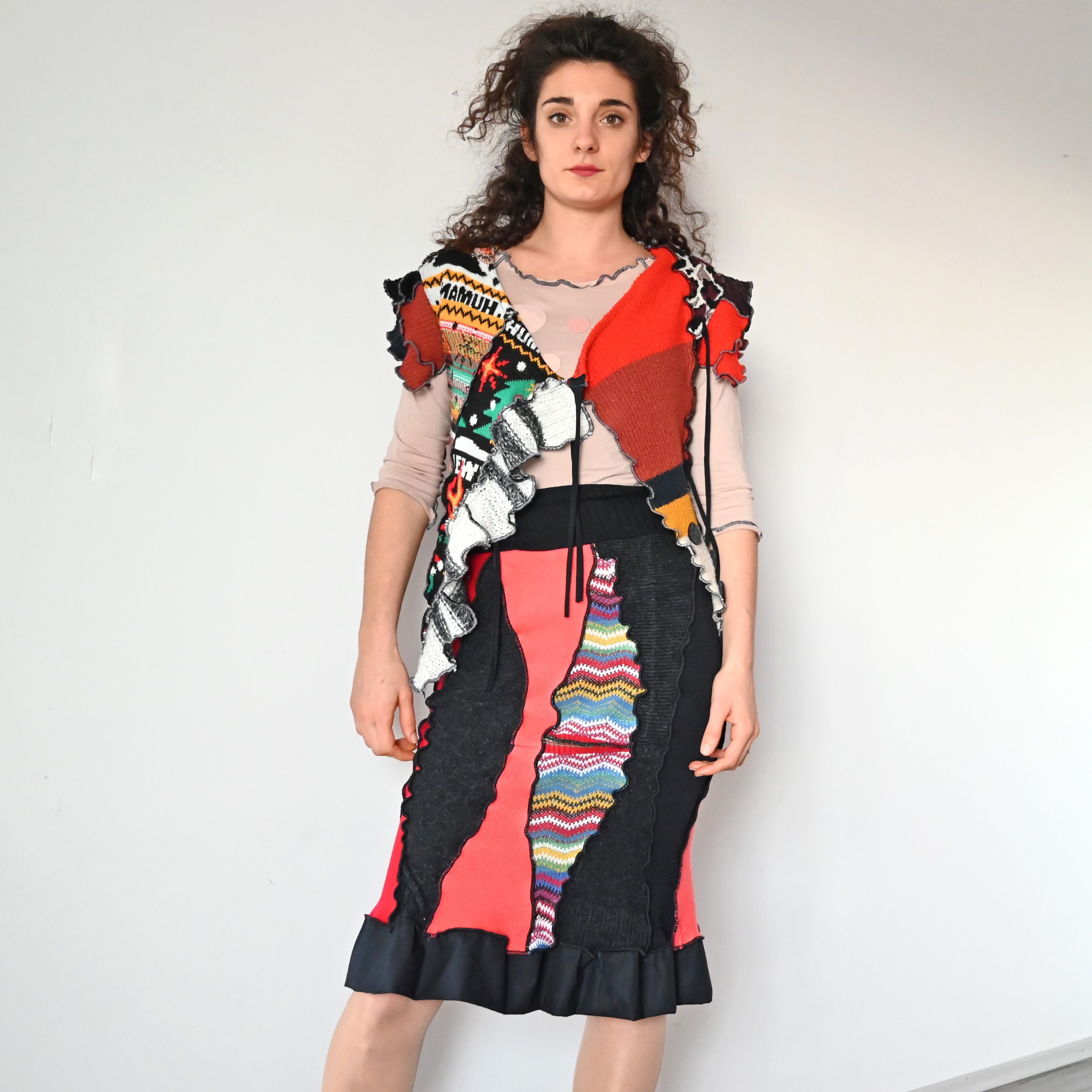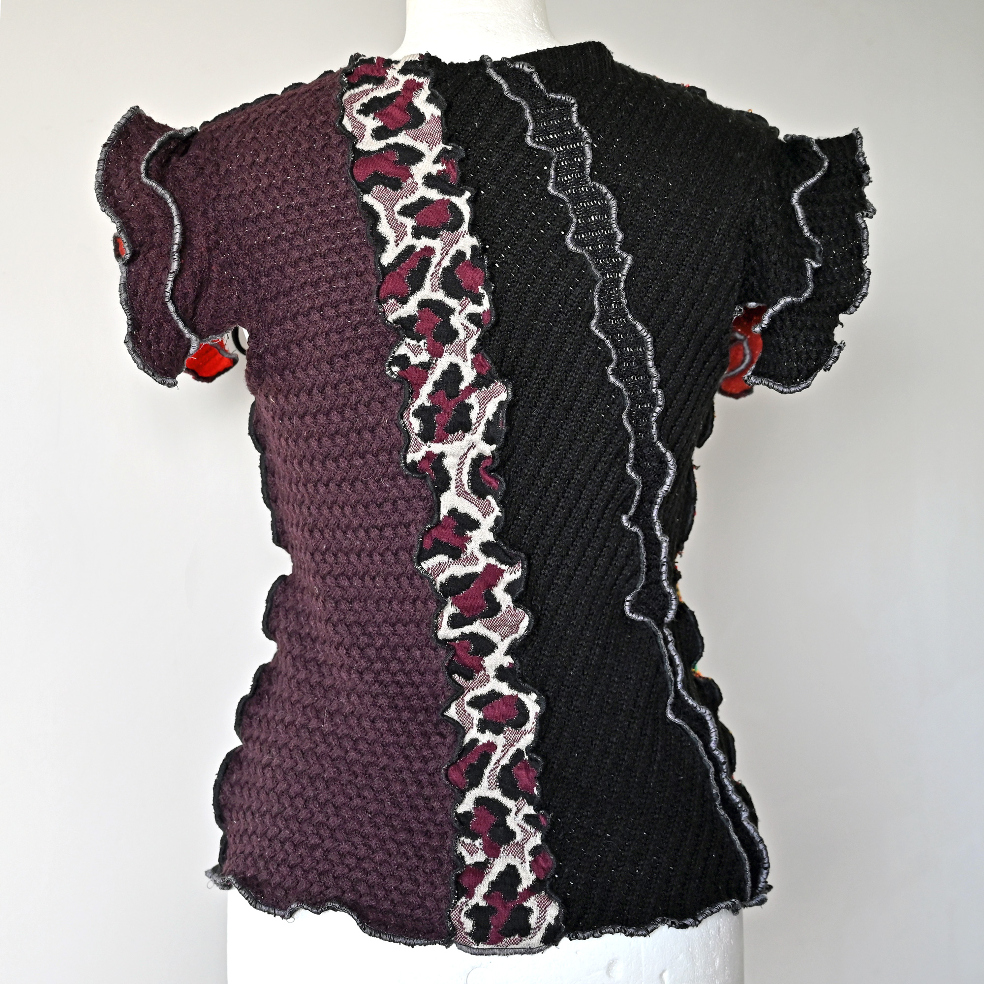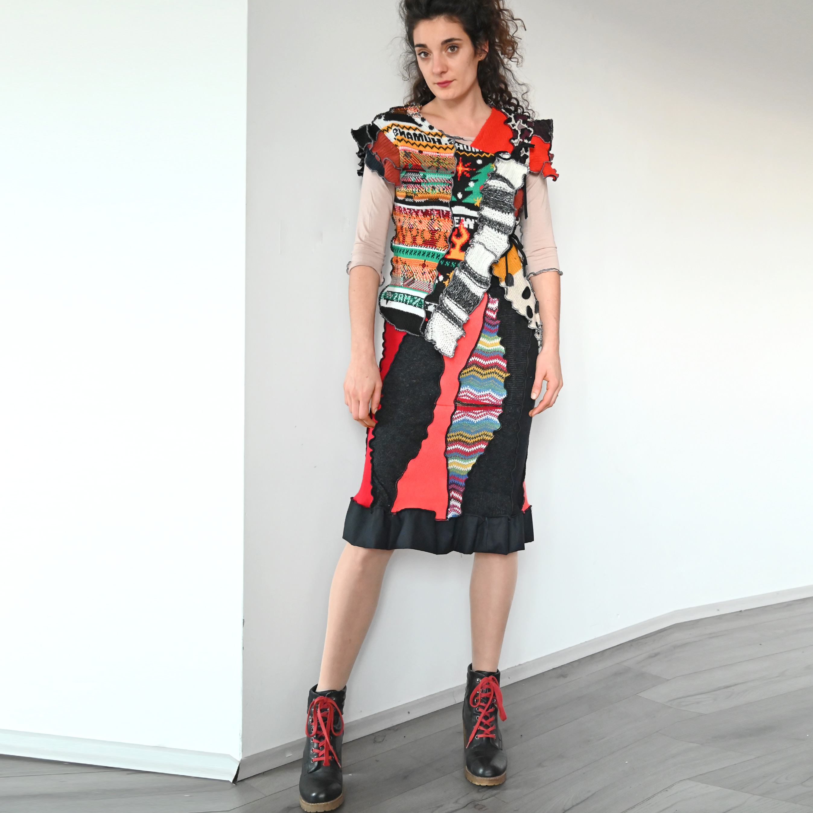 Nadciklirani džemper od različitih pletiva, ekspresivan i suzdržan istovremeno. Duljina na sredini straga oko 55 cm.