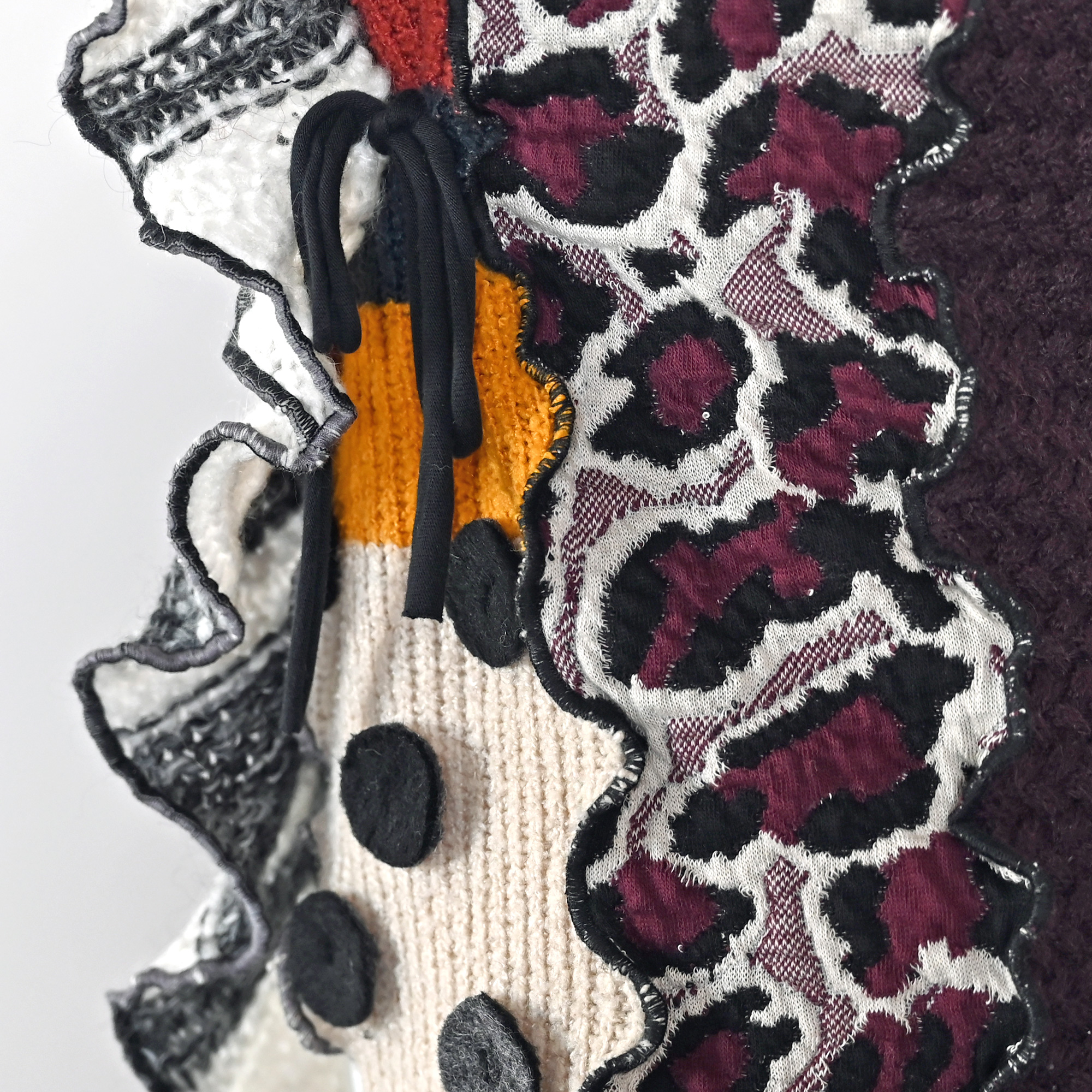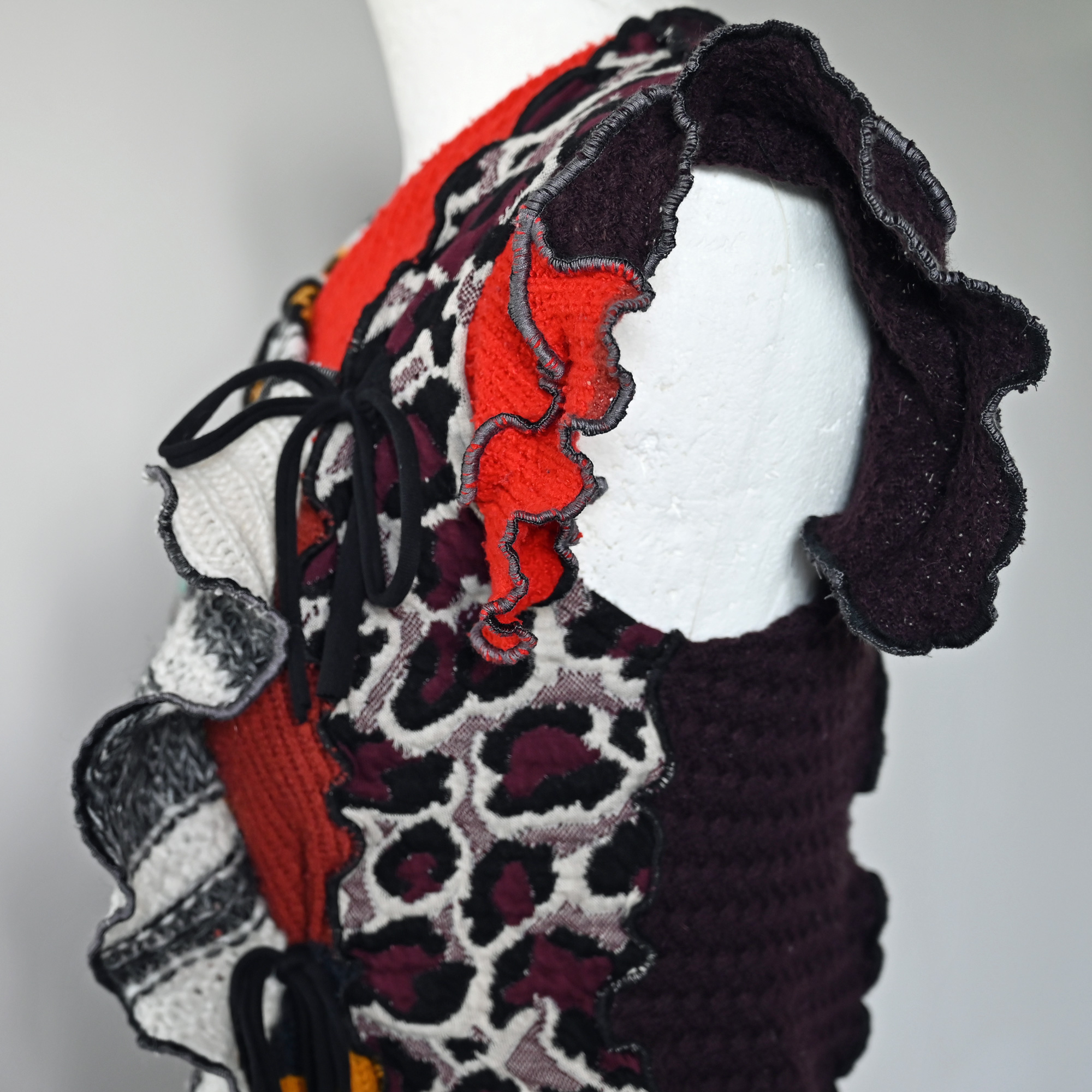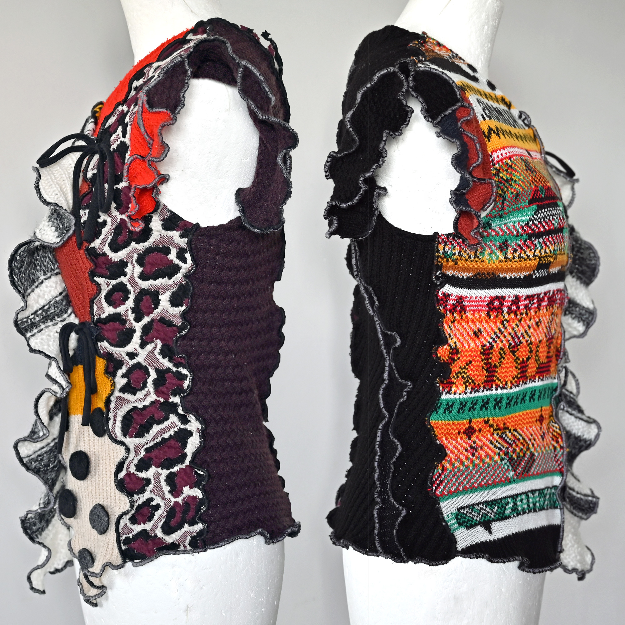 Nadciklirani džemper od različitih pletiva, ekspresivan i suzdržan istovremeno. Duljina na sredini straga oko 55 cm.