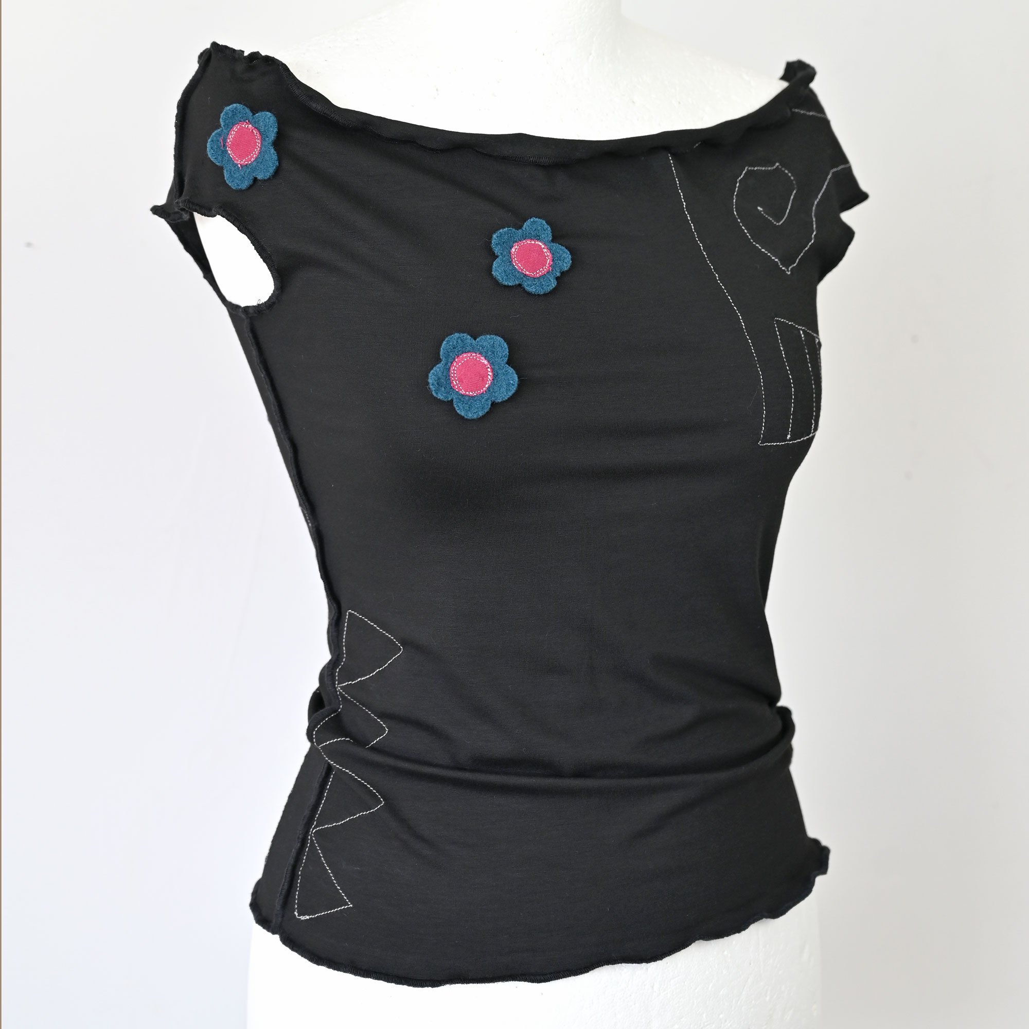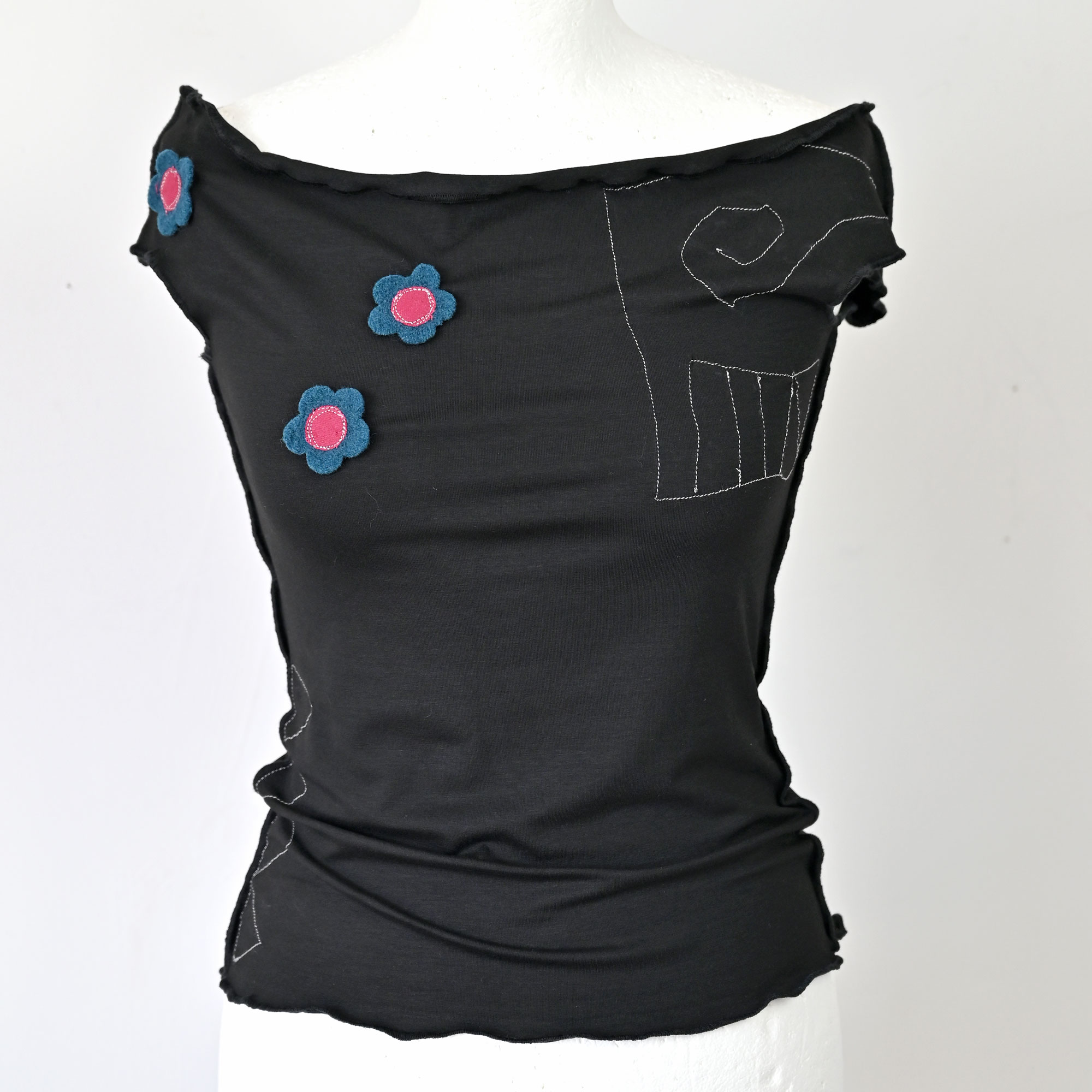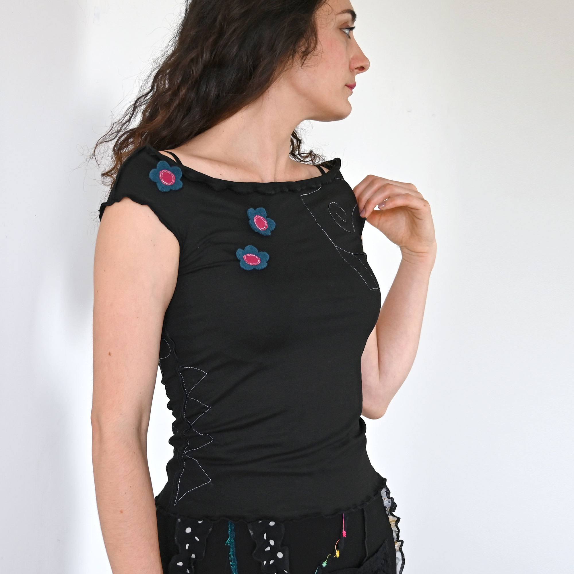 Lagana majica od viskoznog žerseja s elastinom, blago spuštenih ramena. Dugačka oko 58 cm. S našivenim vunenim cvijetom koji zadržava oblik i prilikom mašinskog pranja programom za osjetljive ili miješane tkanine.