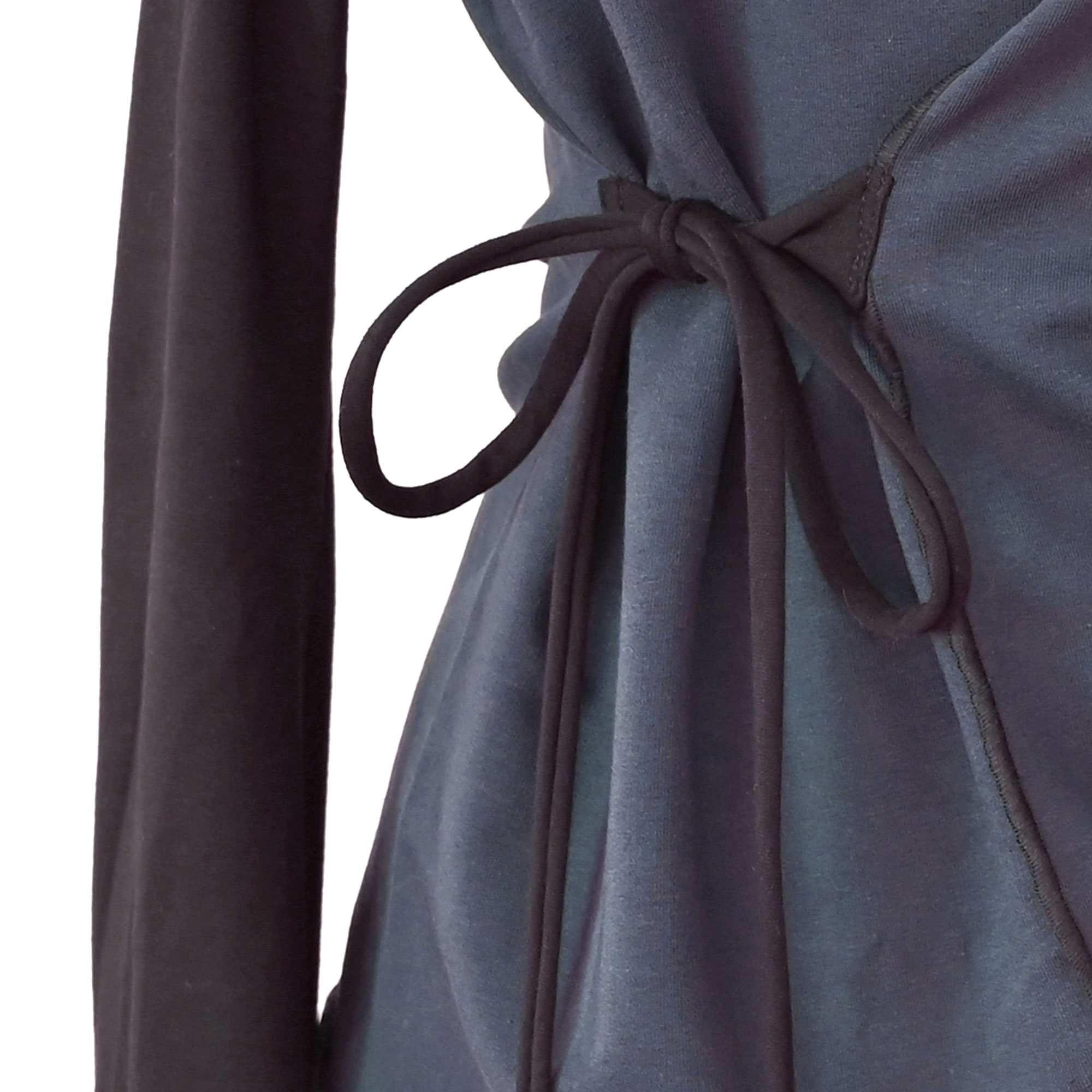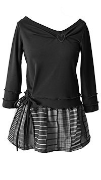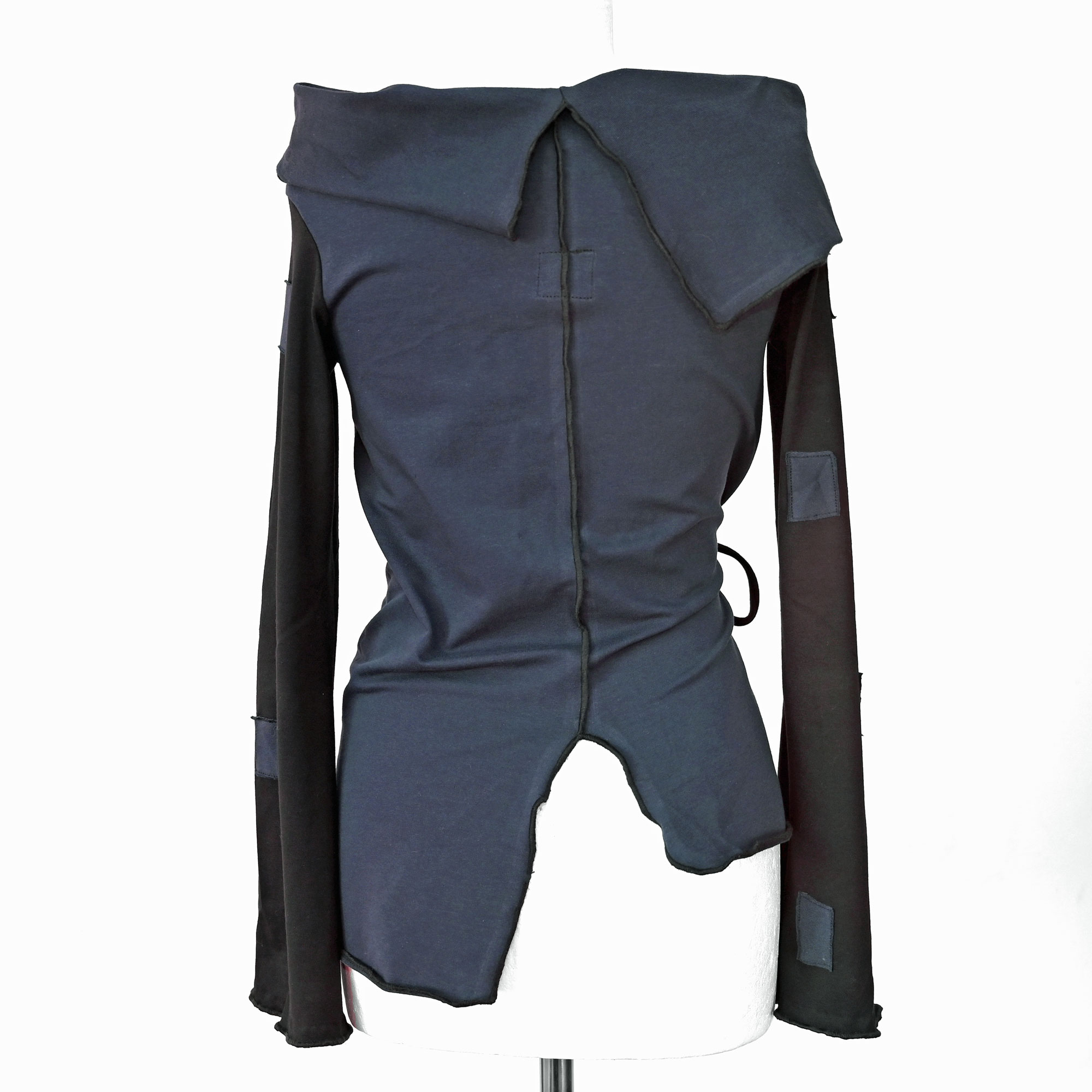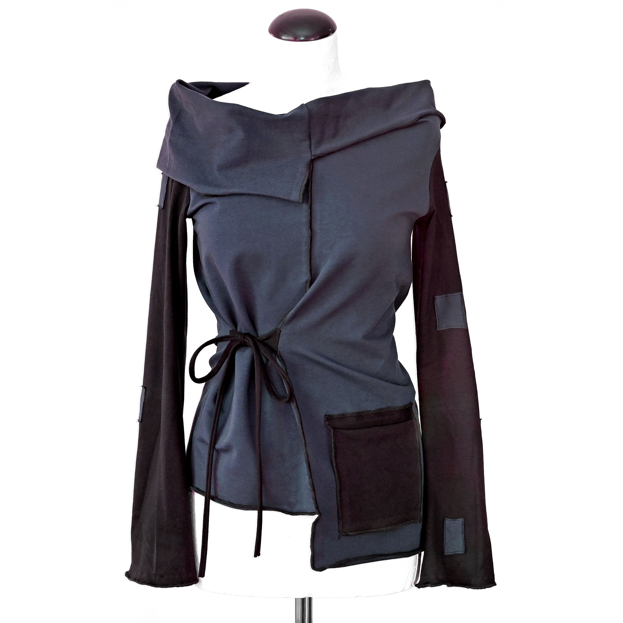 Majica od elastične pamučne felpe, s rukavima i dodacima od punijeg viskoznog žerseja s elastinom. Nesimetrična. Rukavi se šire prema dolje.