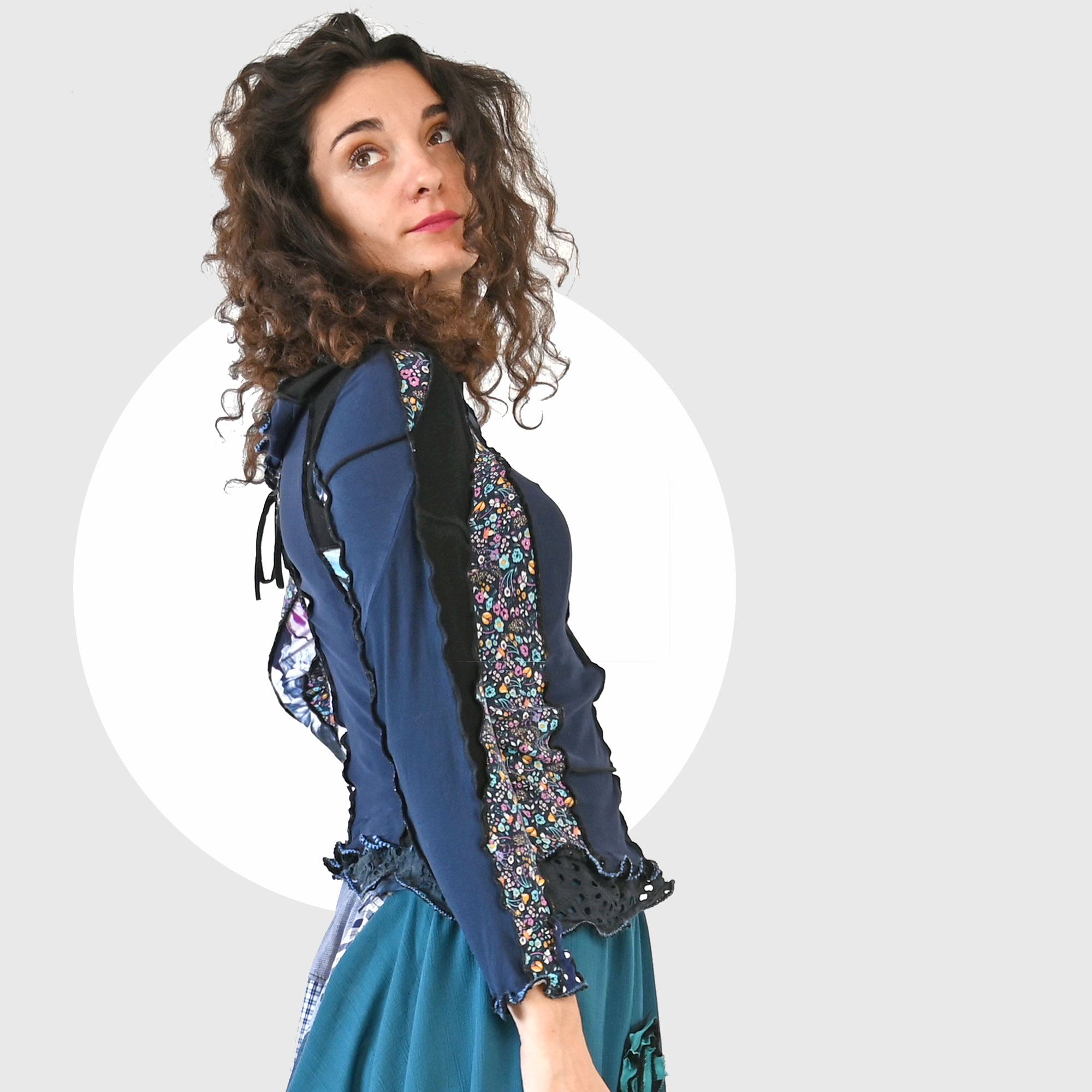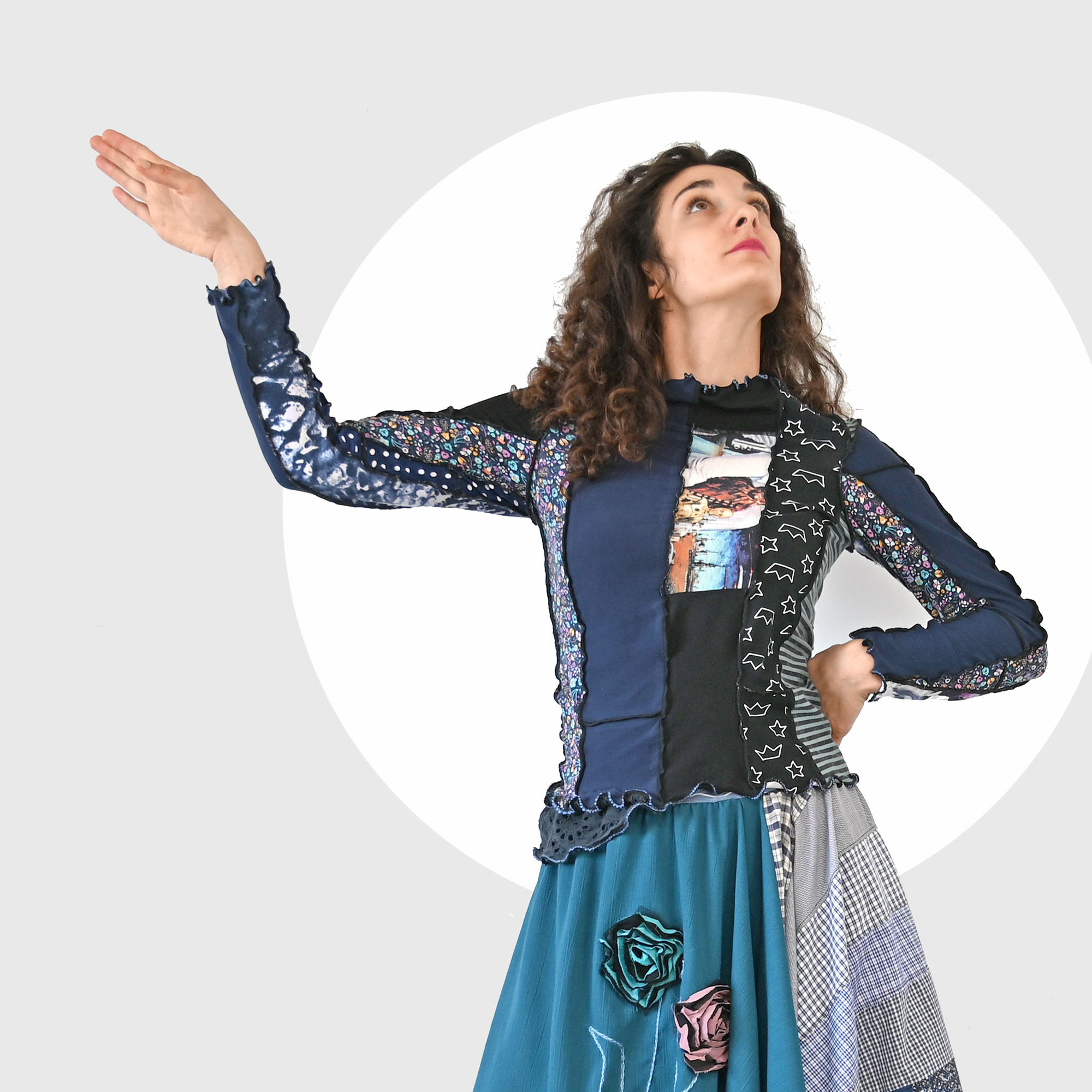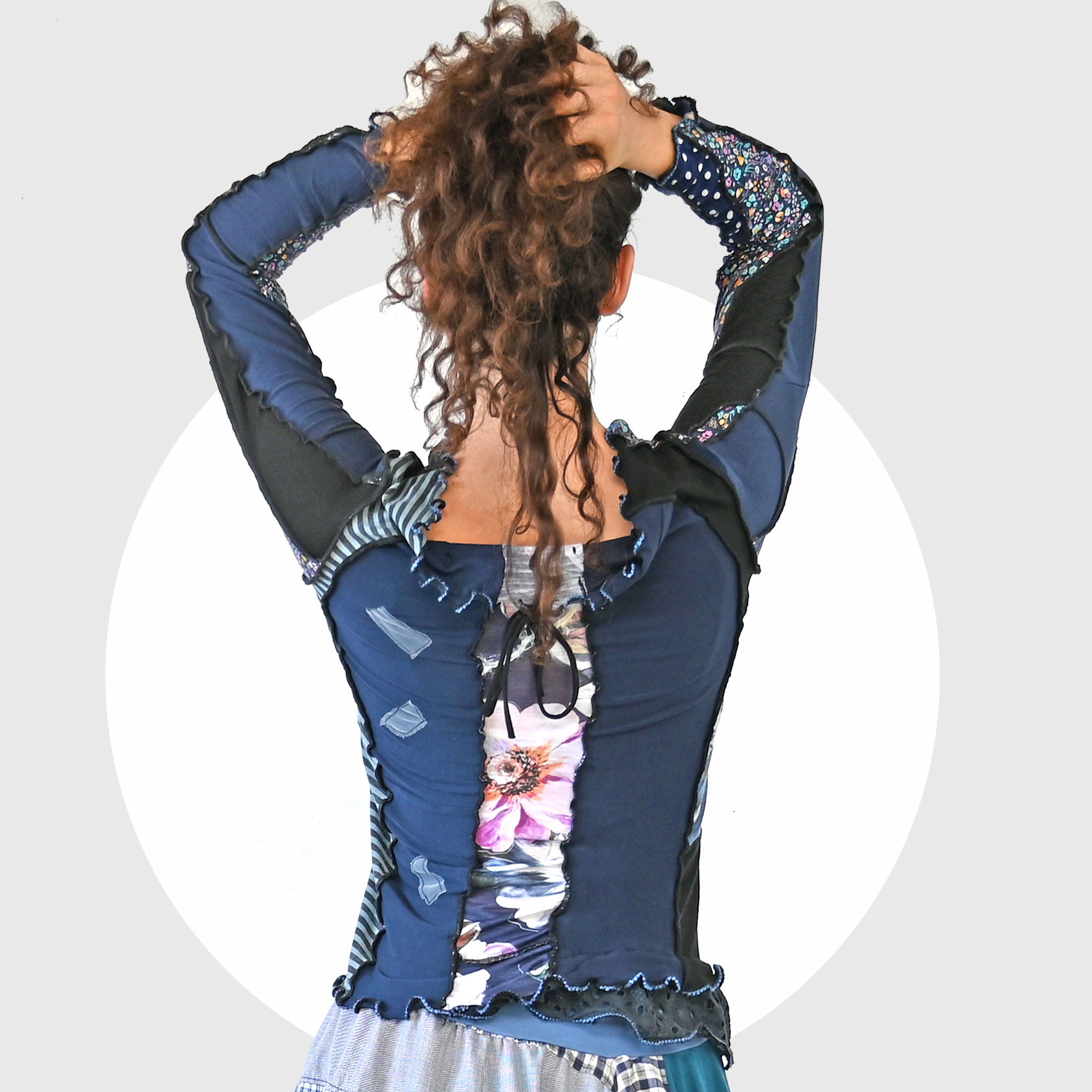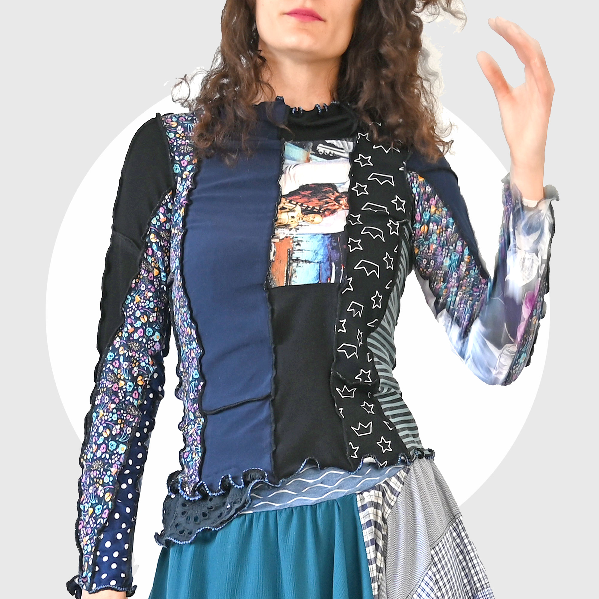 Majica nadciklirana od pamučnih i viskoznih žerseja, s volanom od pamučne rupičaste tkanine. Sami birate prednjicu/leđa majice, ovisno o raspoloženju i garderobi. Duljina majice i rukava su jednaki, oko 57 cm.