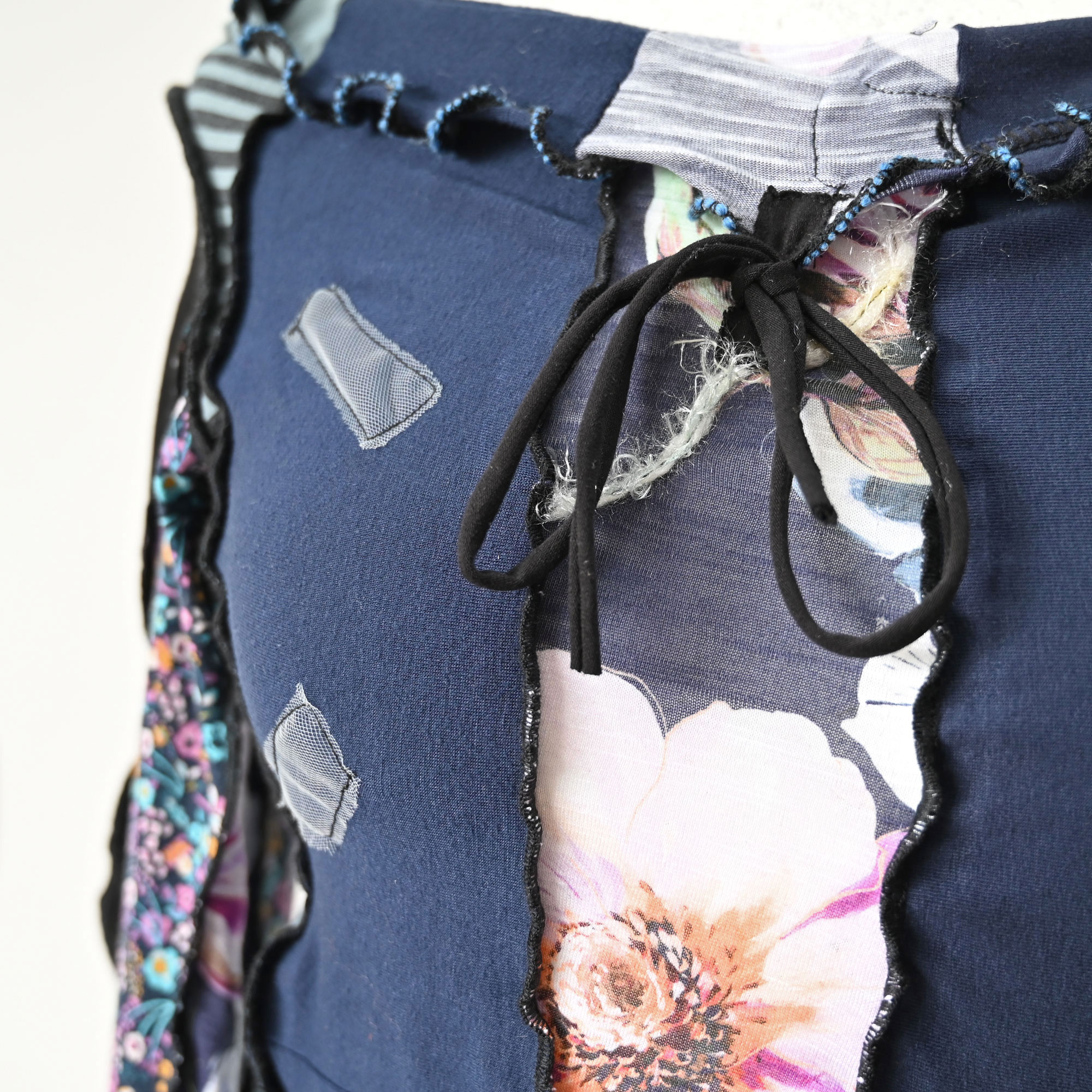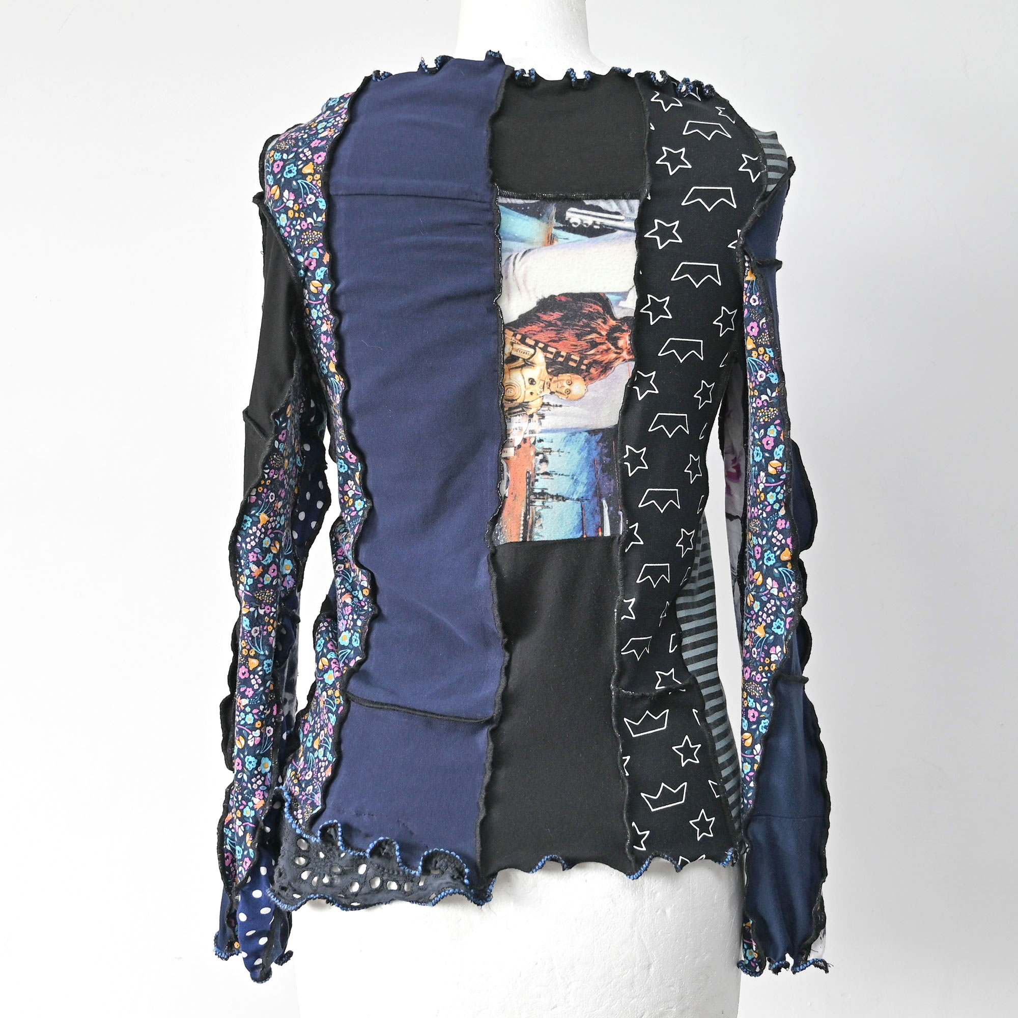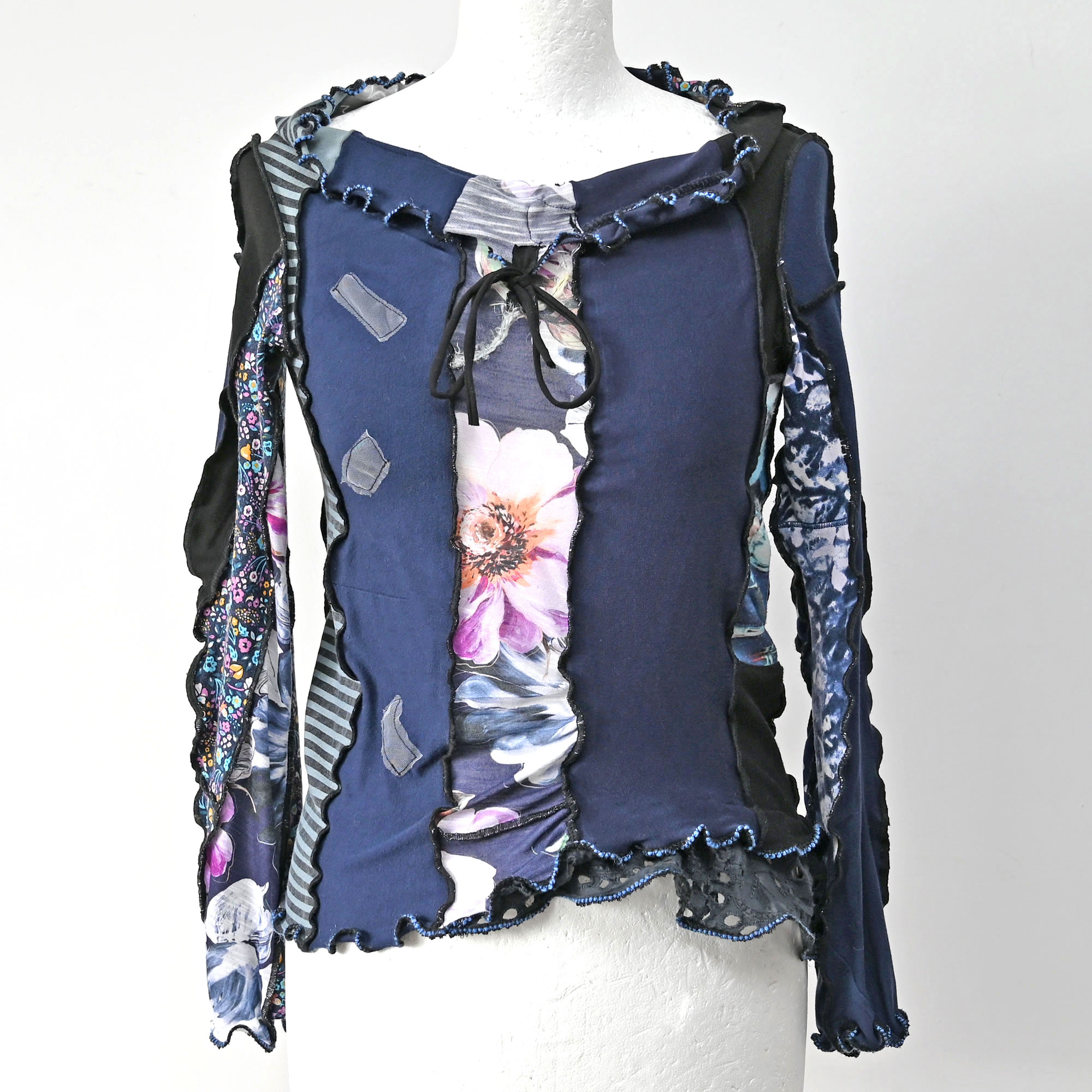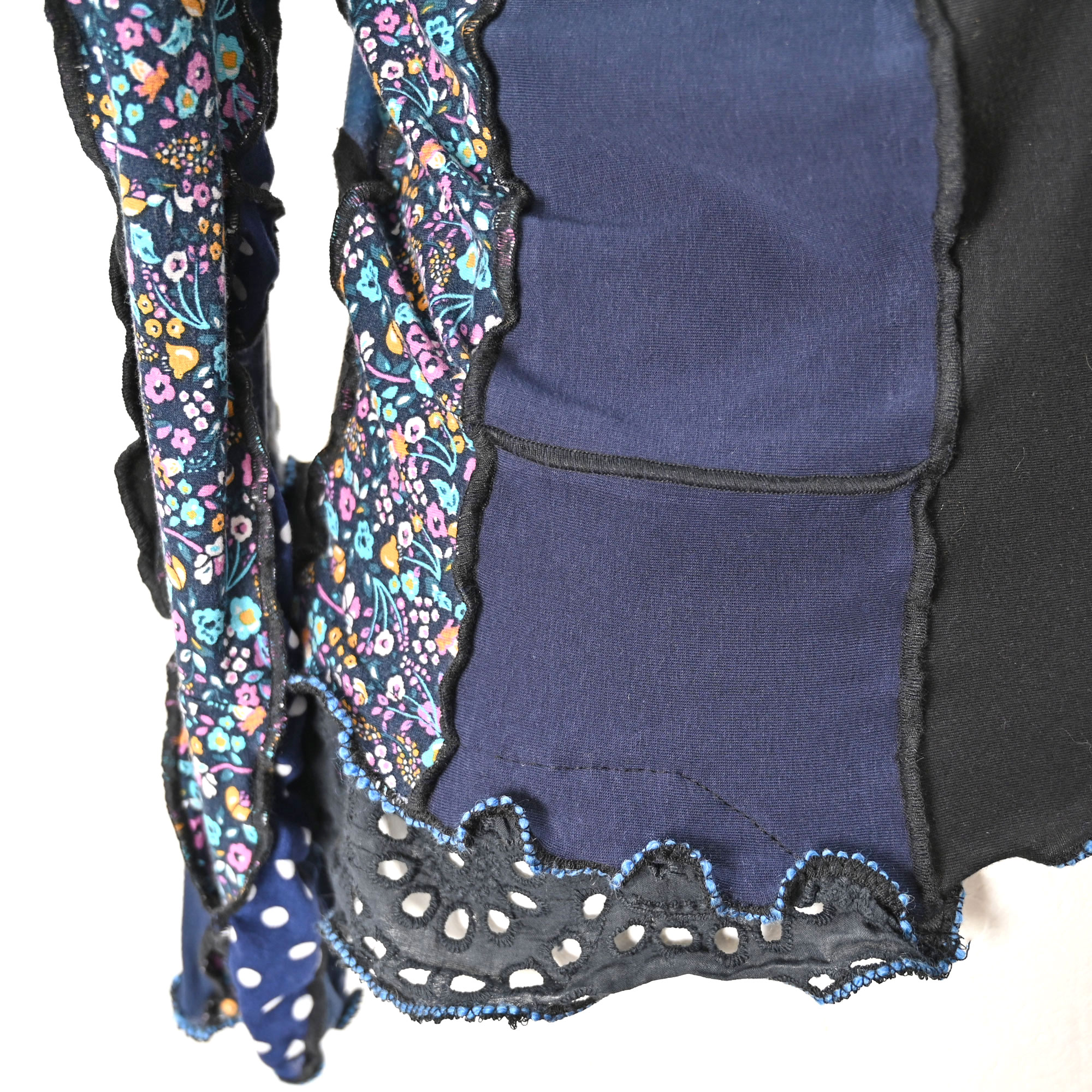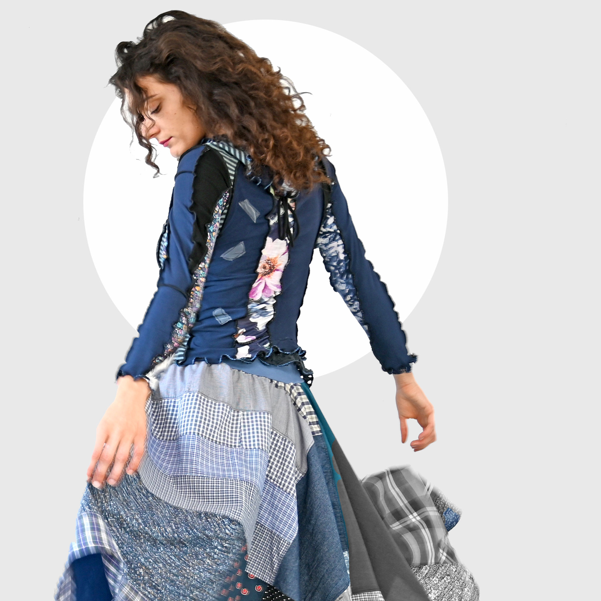 Majica nadciklirana od pamučnih i viskoznih žerseja, s volanom od pamučne rupičaste tkanine. Sami birate prednjicu/leđa majice, ovisno o raspoloženju i garderobi. Duljina majice i rukava su jednaki, oko 57 cm.