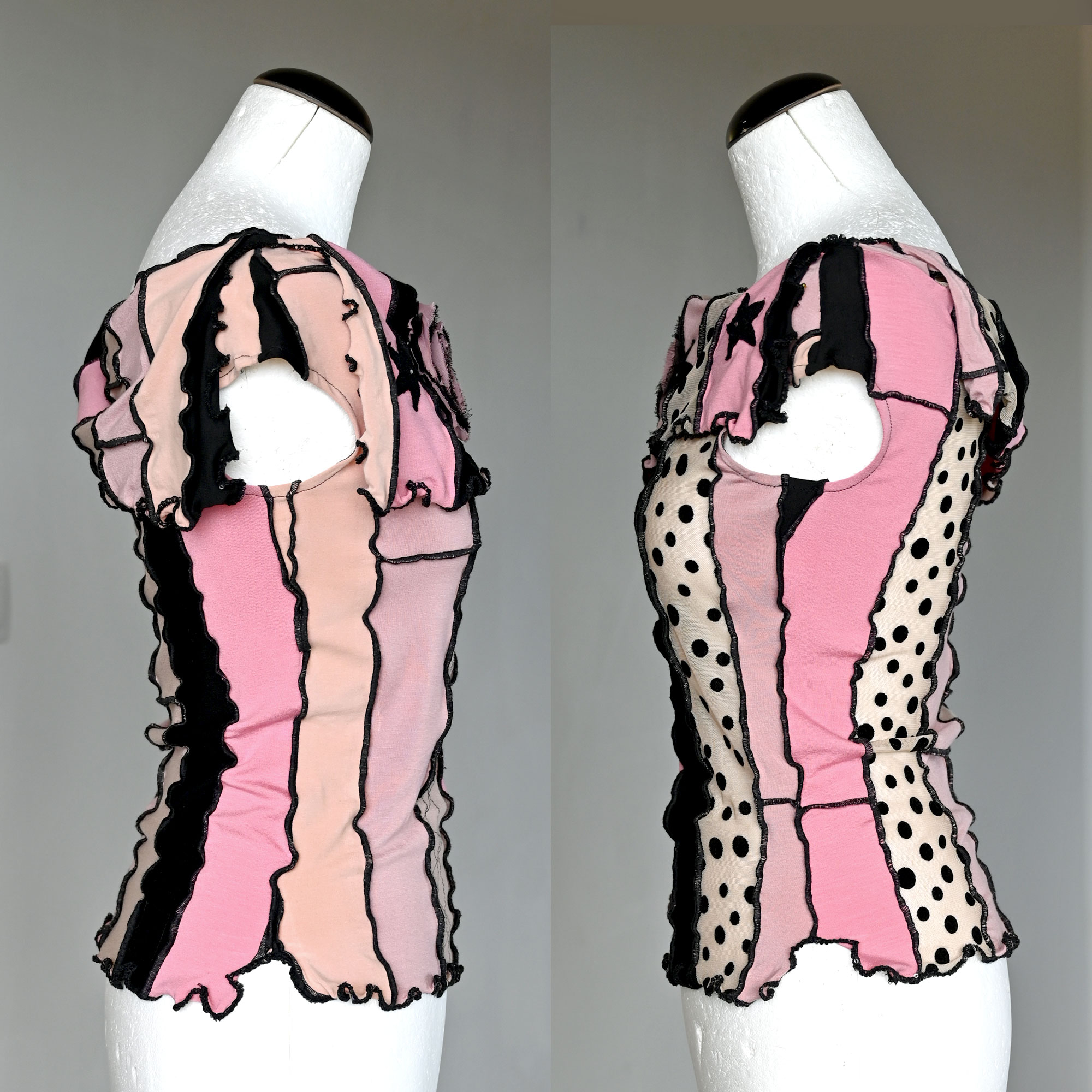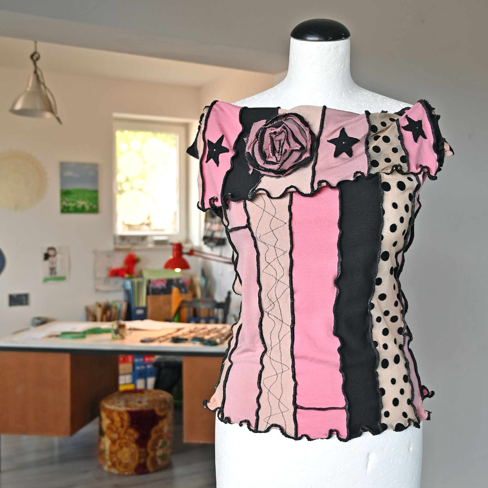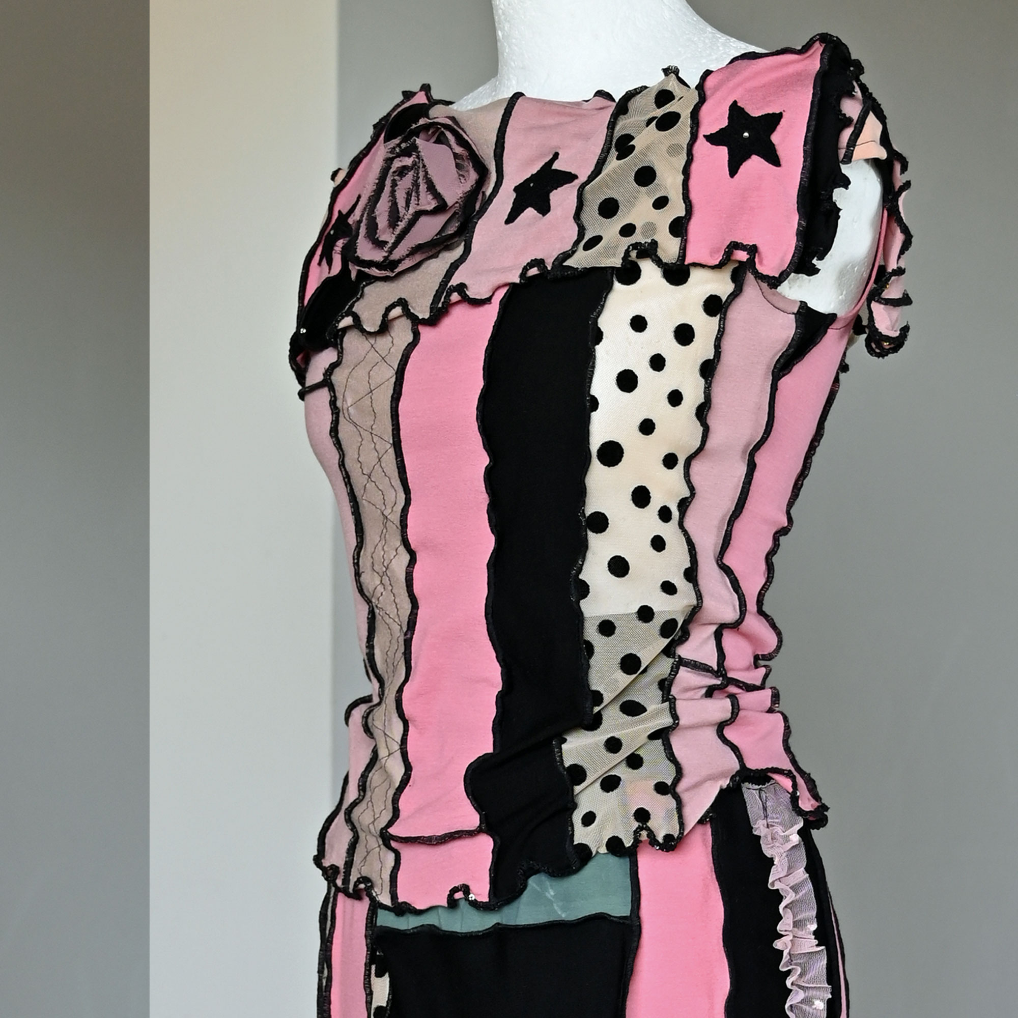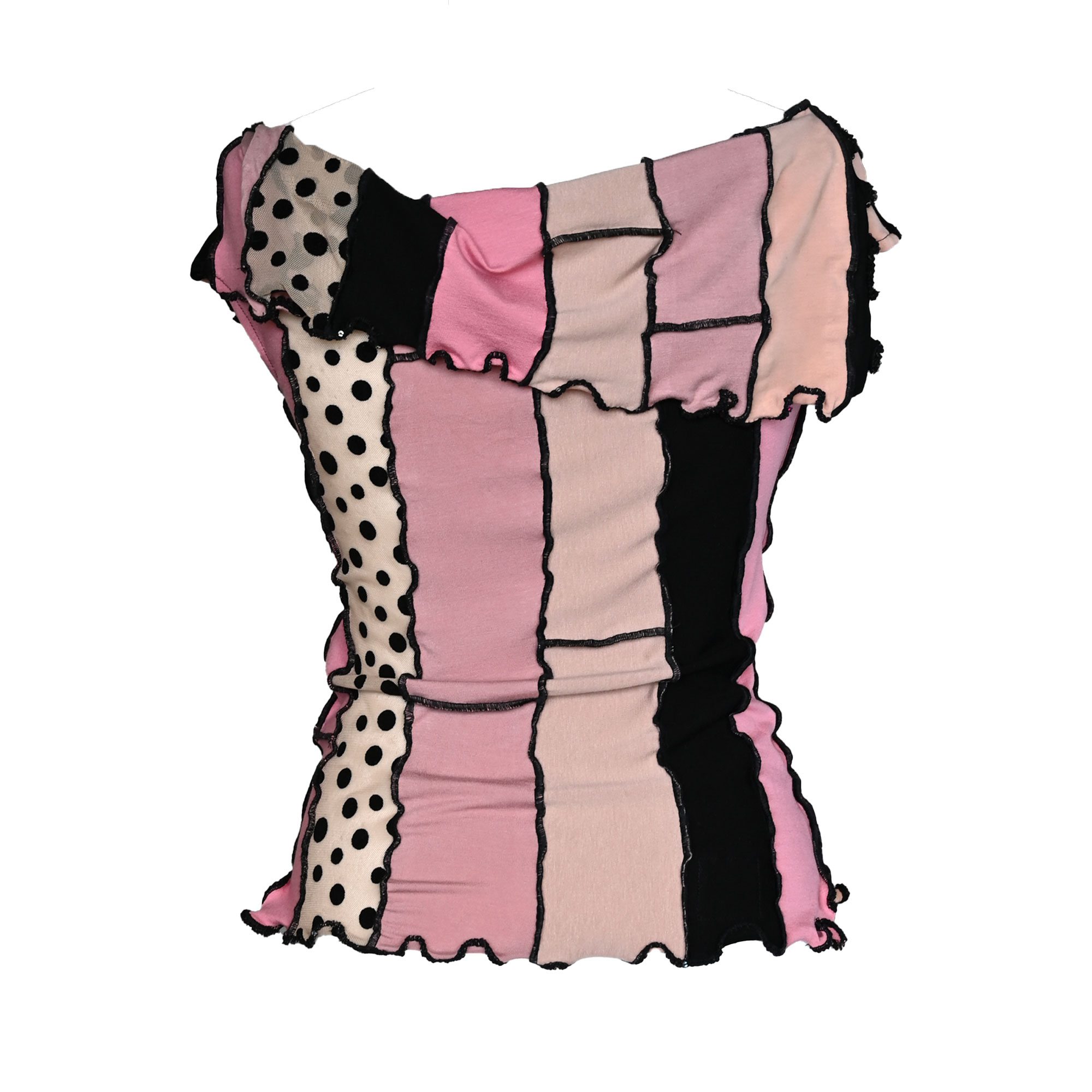 Majica od različitih ostataka viskoznih žerseja, sa strateški dodanim prozirnim točkastim žersejom od umjetnih vlakana. Majica ima preklopljeni dio na vrhu. dugačka je oko 55 cm.