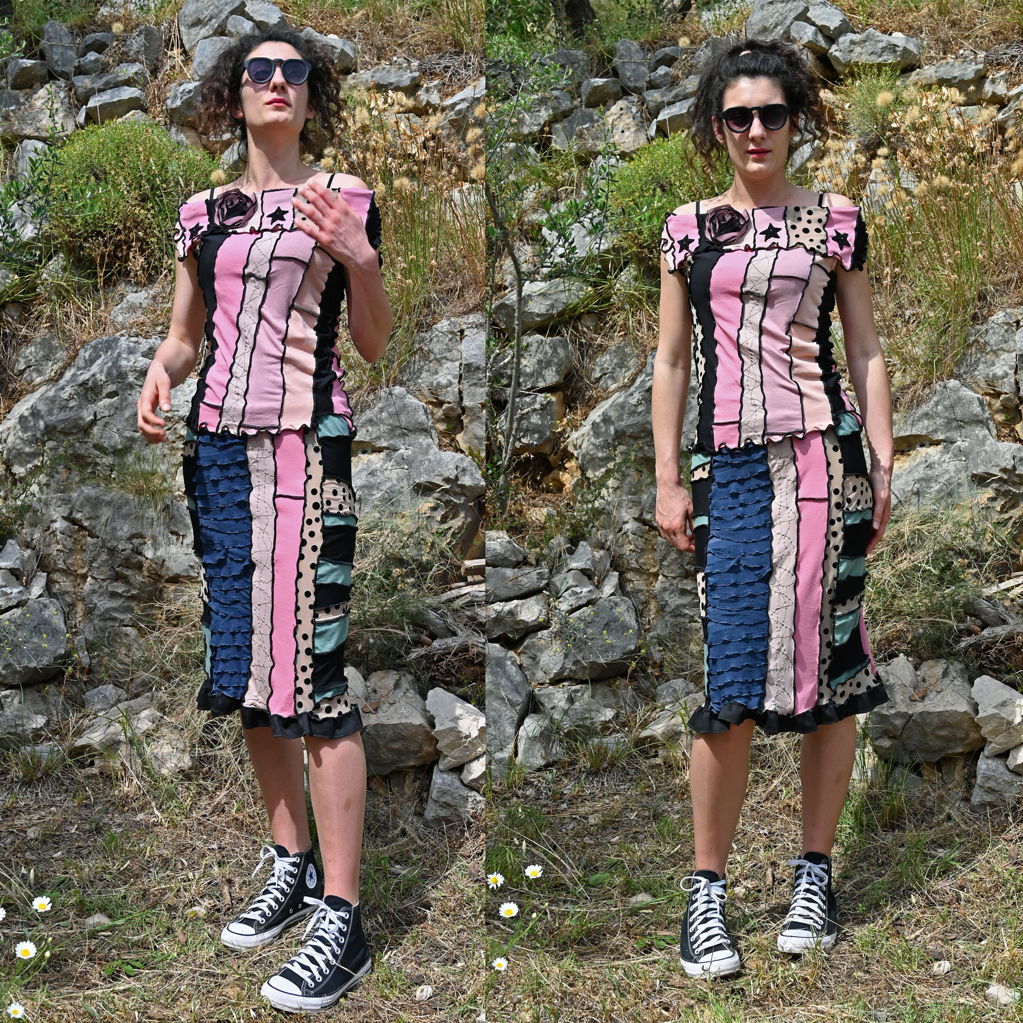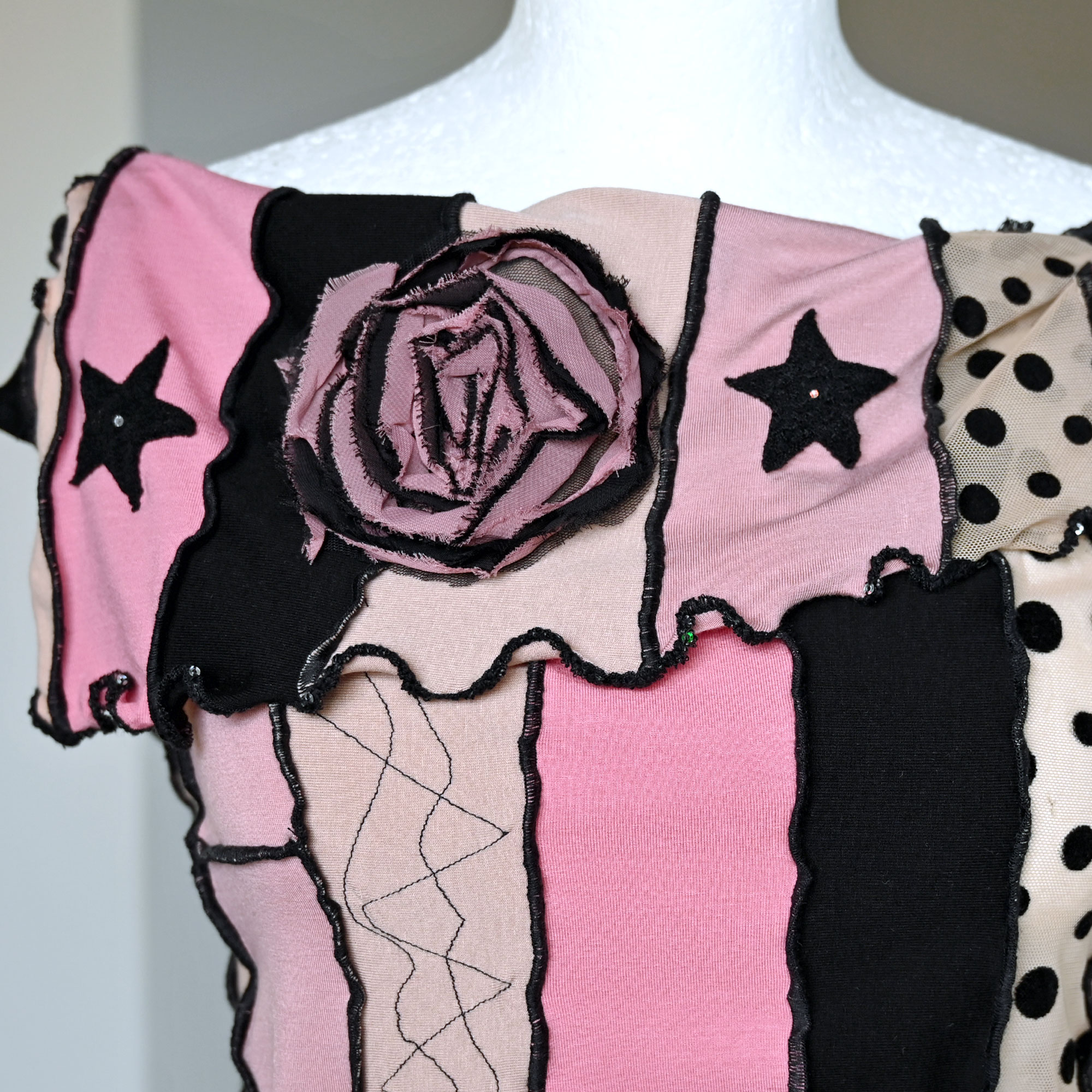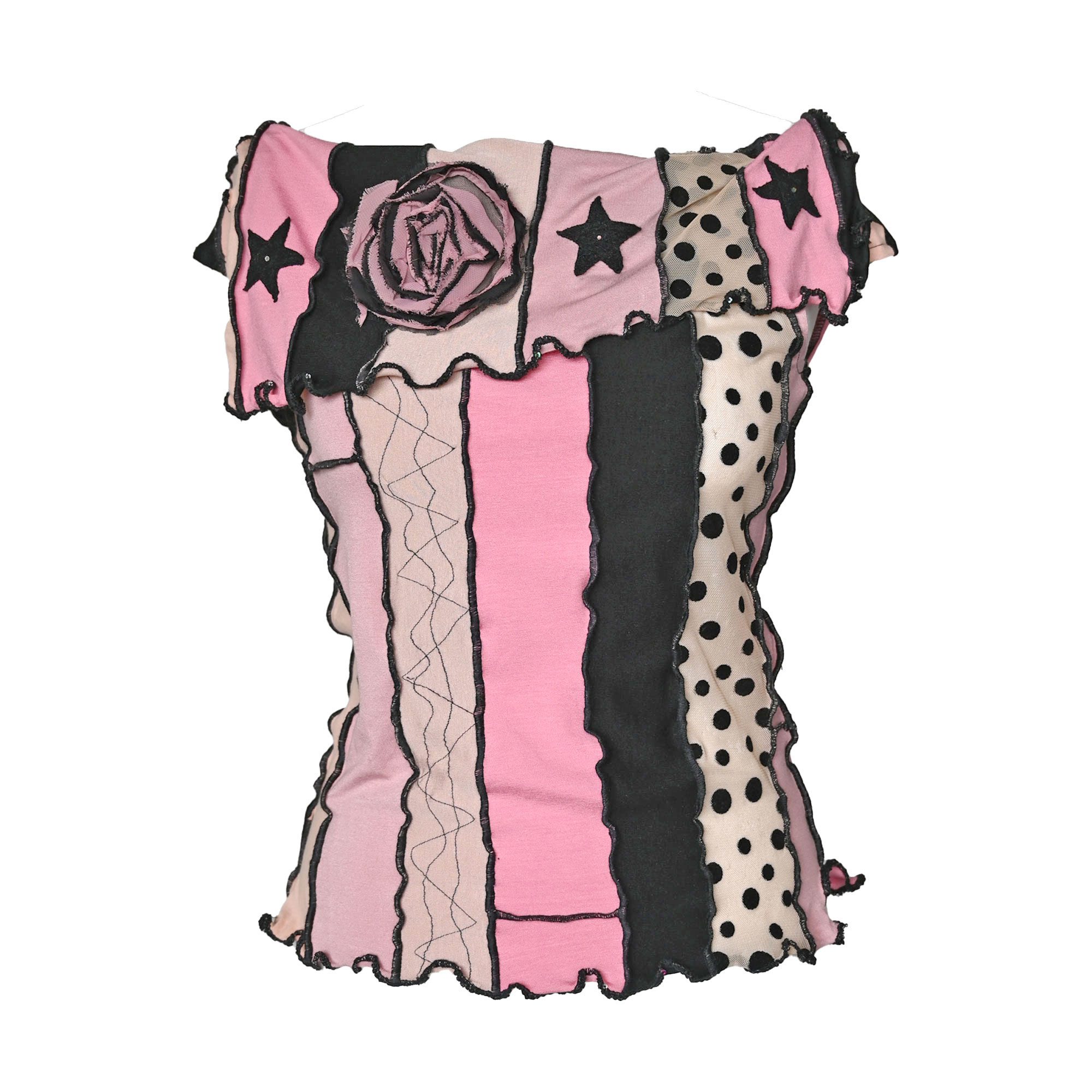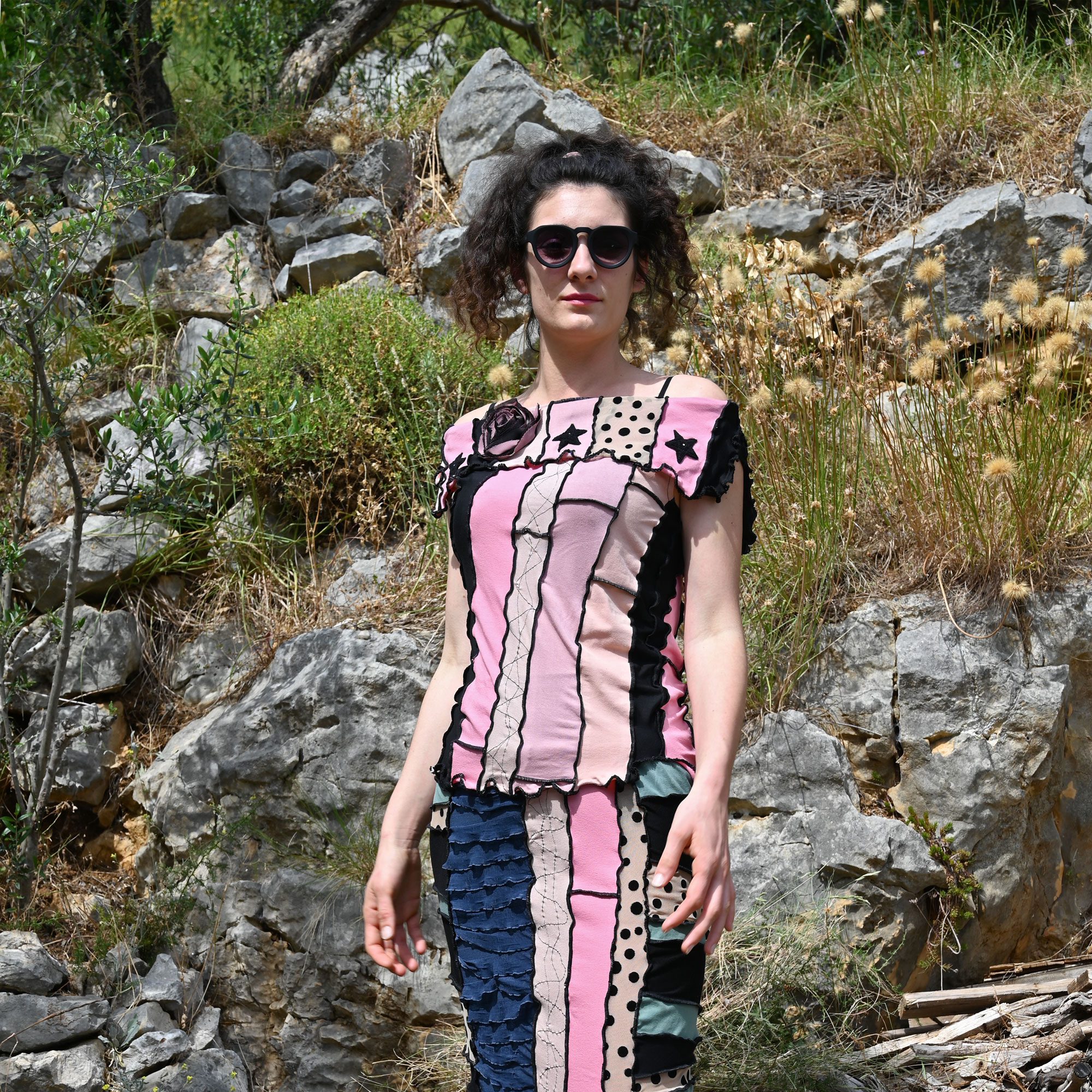 Majica od različitih ostataka viskoznih žerseja, sa strateški dodanim prozirnim točkastim žersejom od umjetnih vlakana. Majica ima preklopljeni dio na vrhu. dugačka je oko 55 cm.