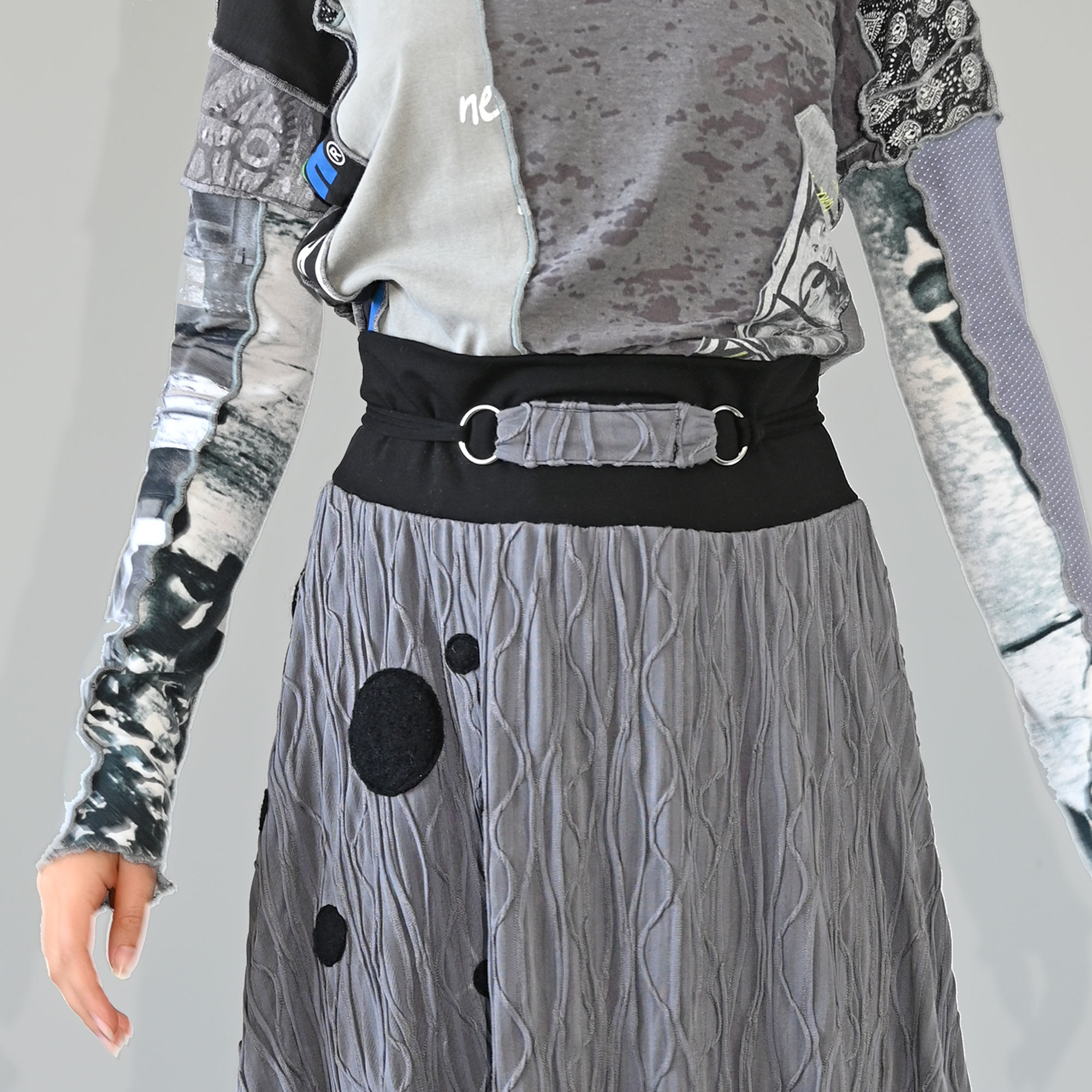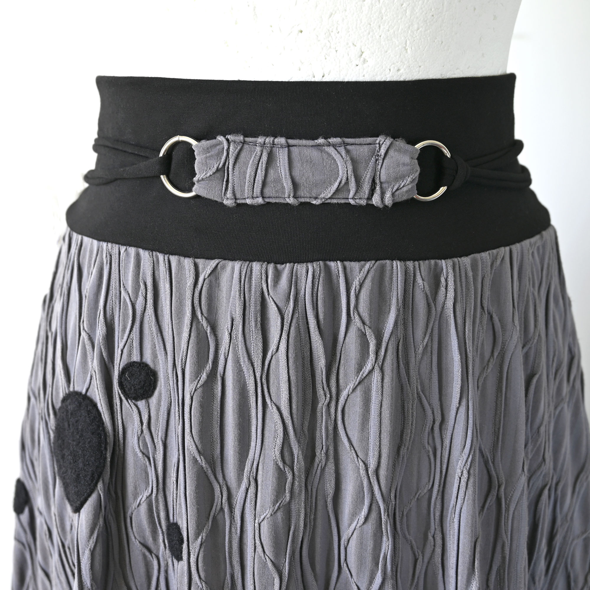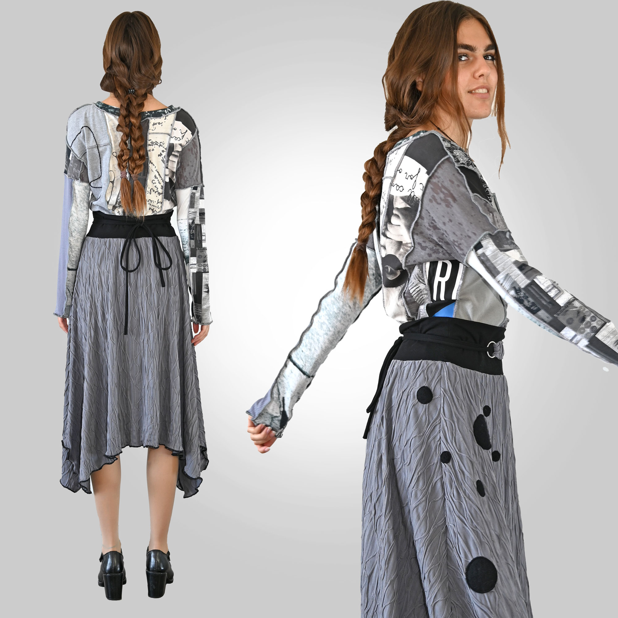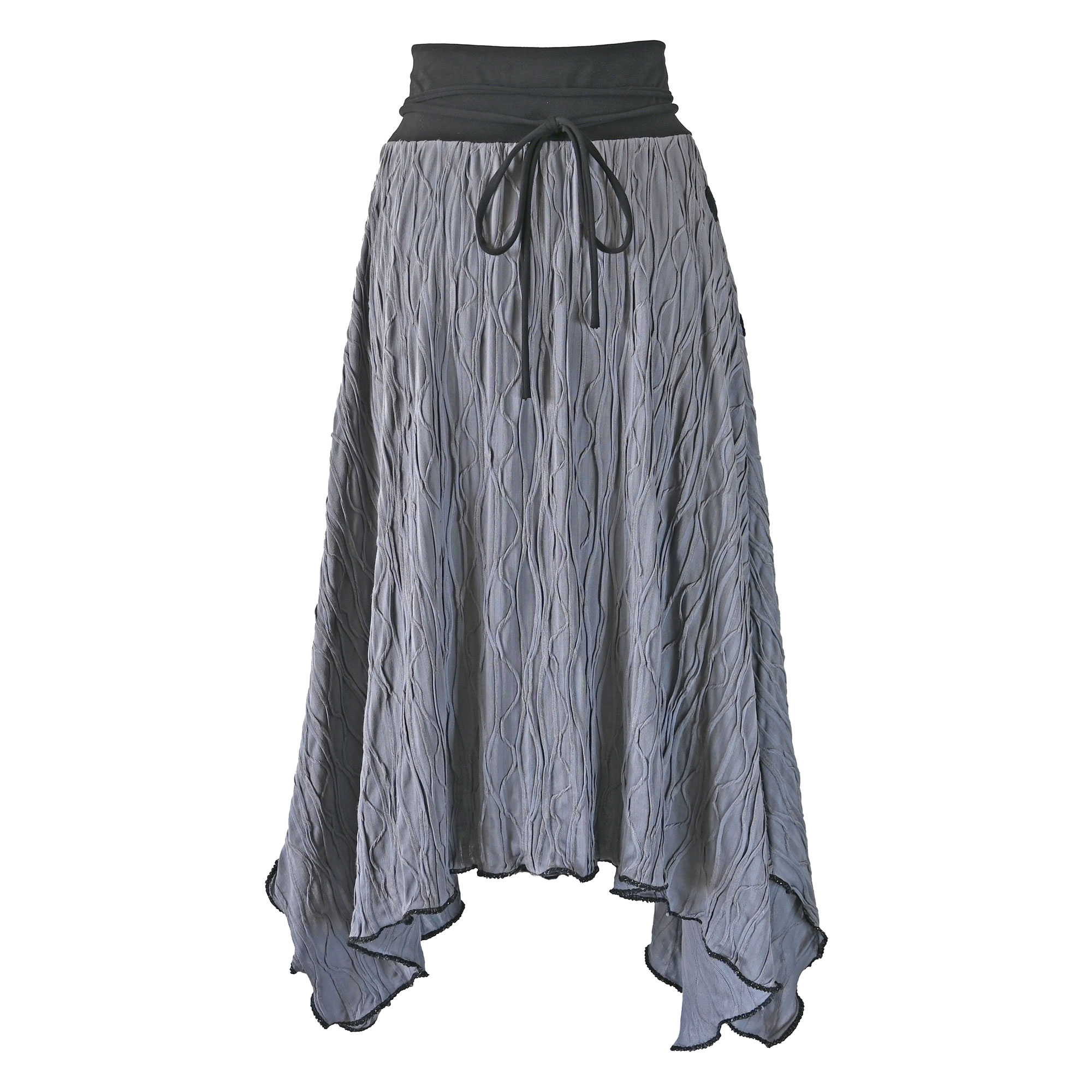 Suknja A kroja, s elastičnom pasicom i vezivanjem oko struka.