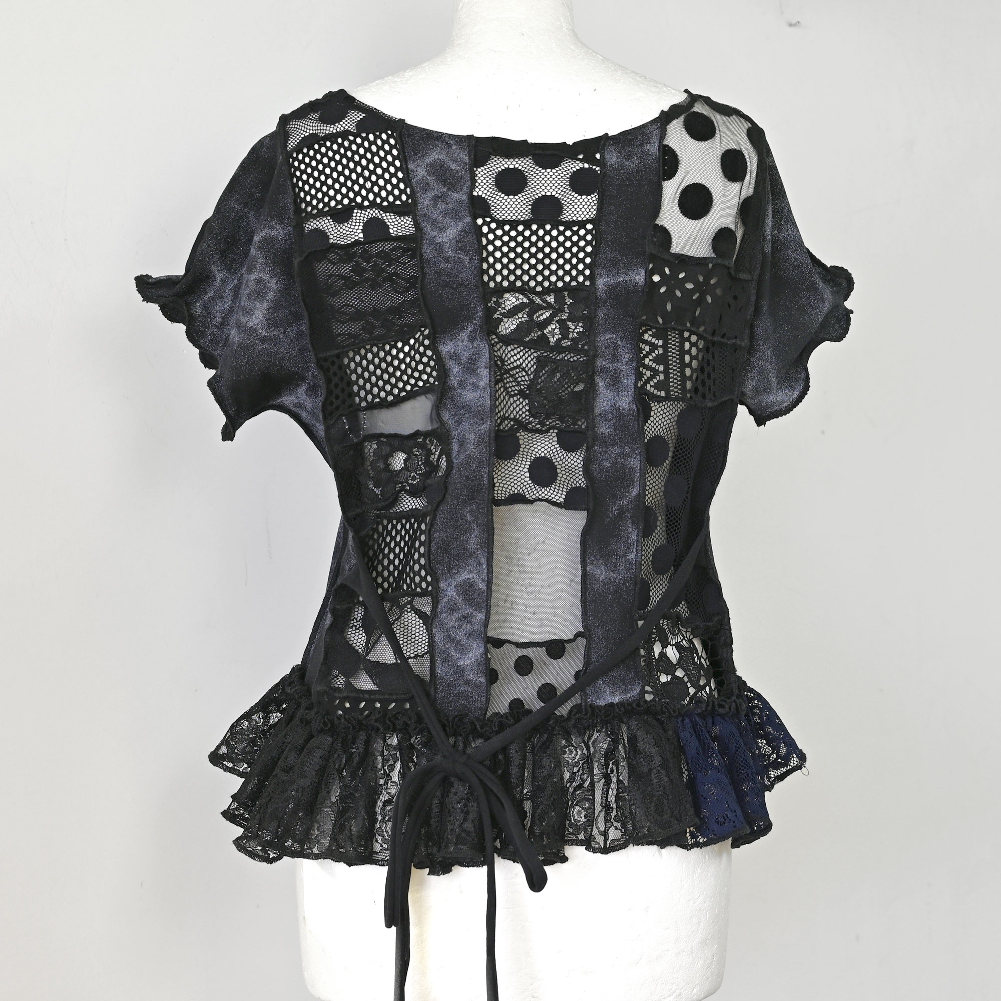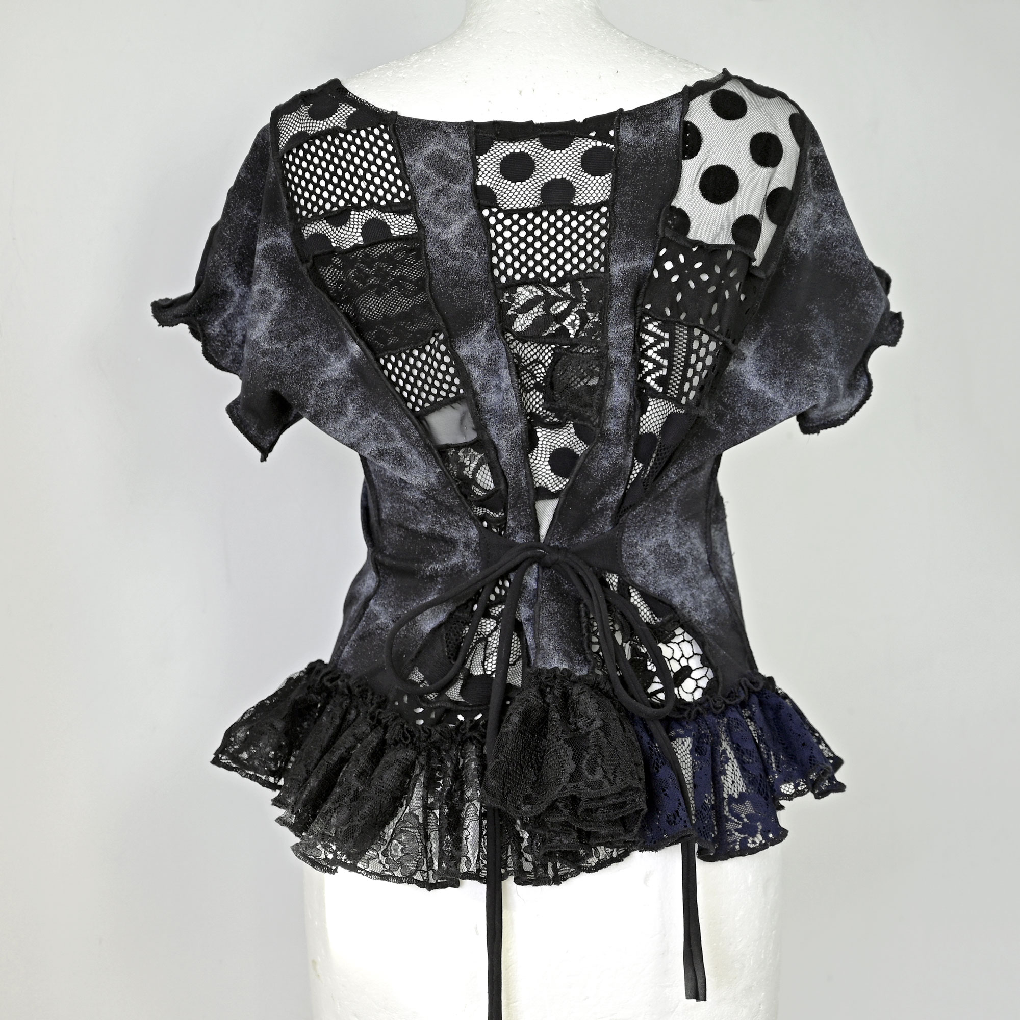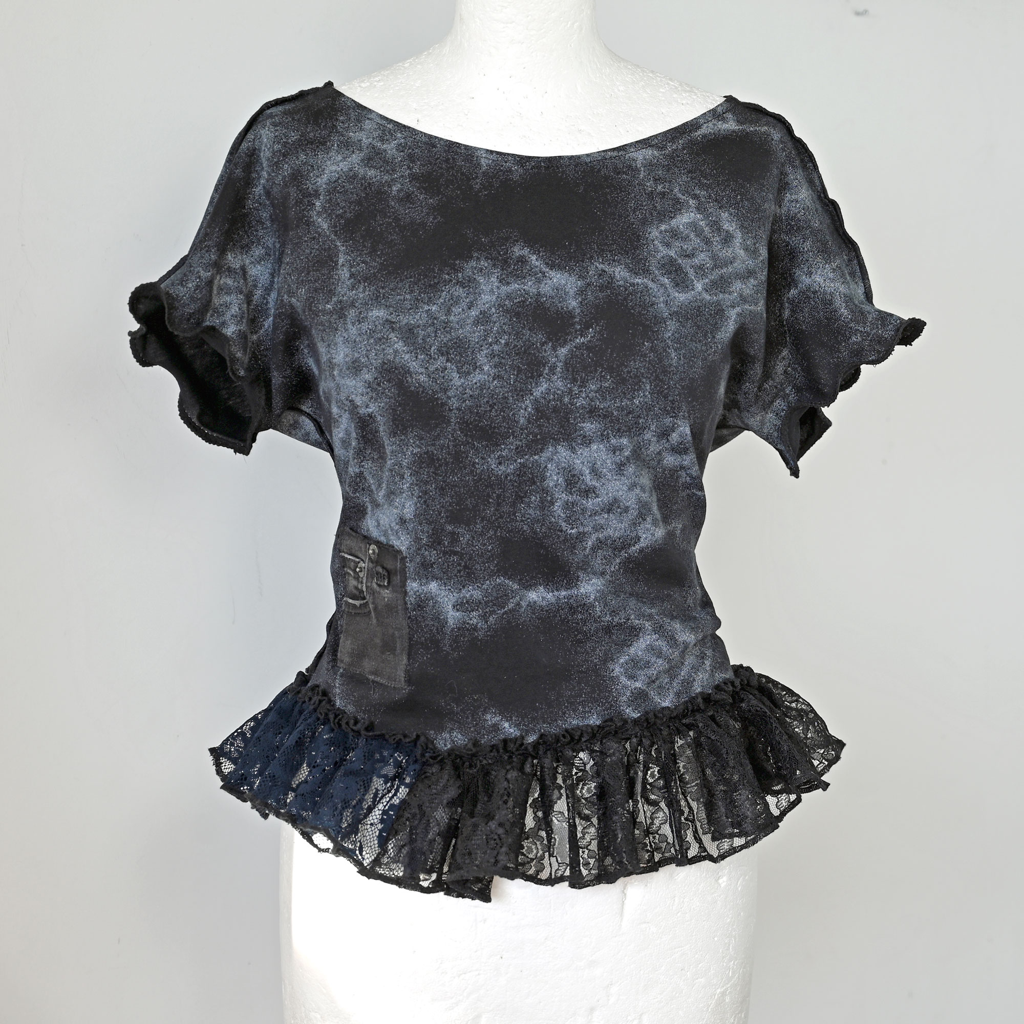 Lagana pamučna majica s umecima od različitih tilova, ostataka iz prošlih projekata. Volan na dnu je nadcikliran od Zarinih i HM-ovih čipkastih haljina.