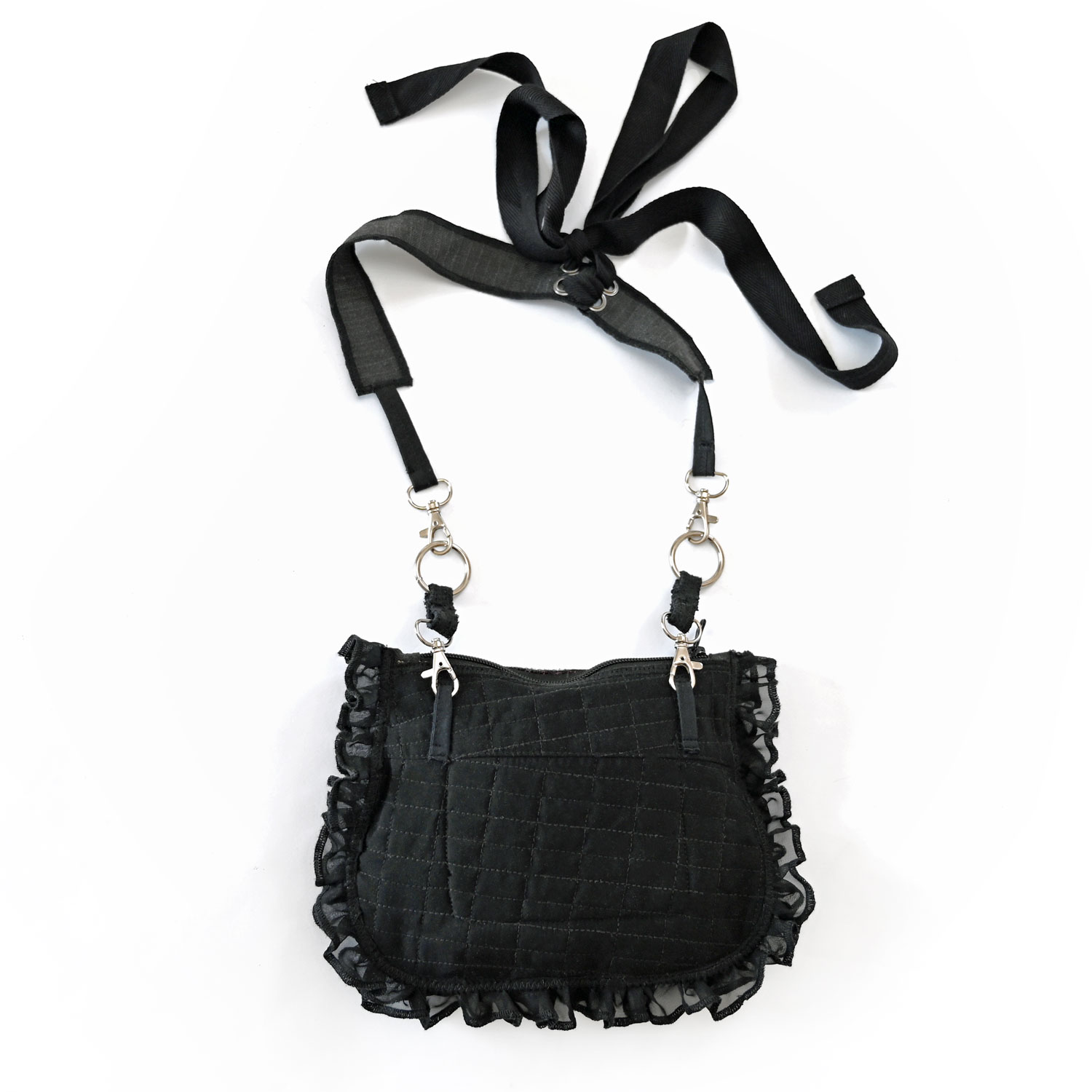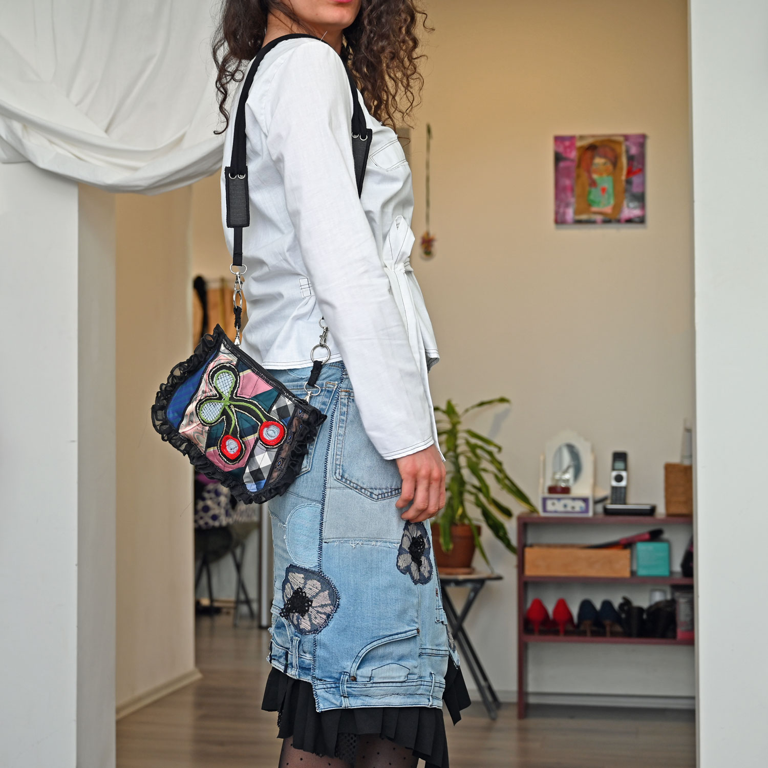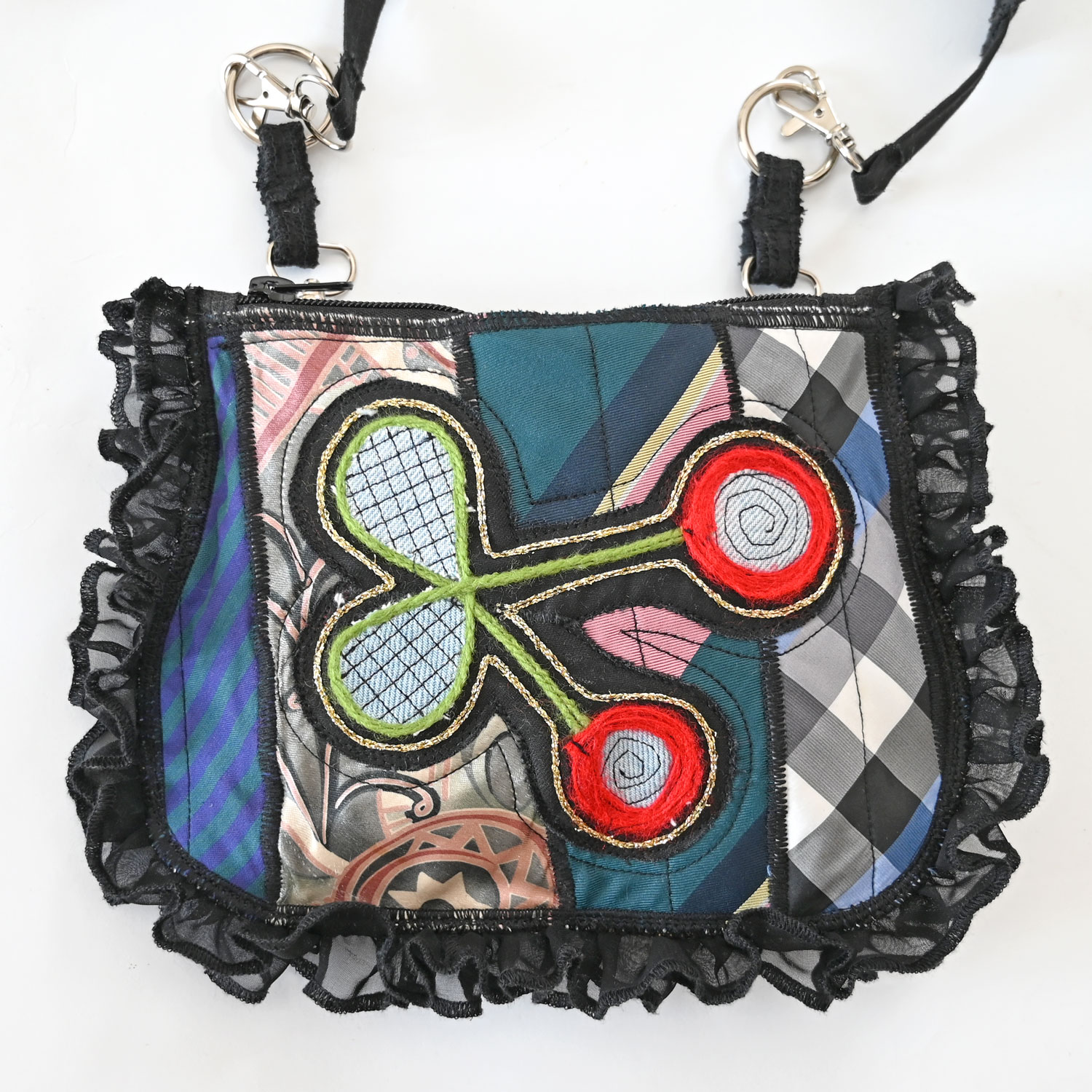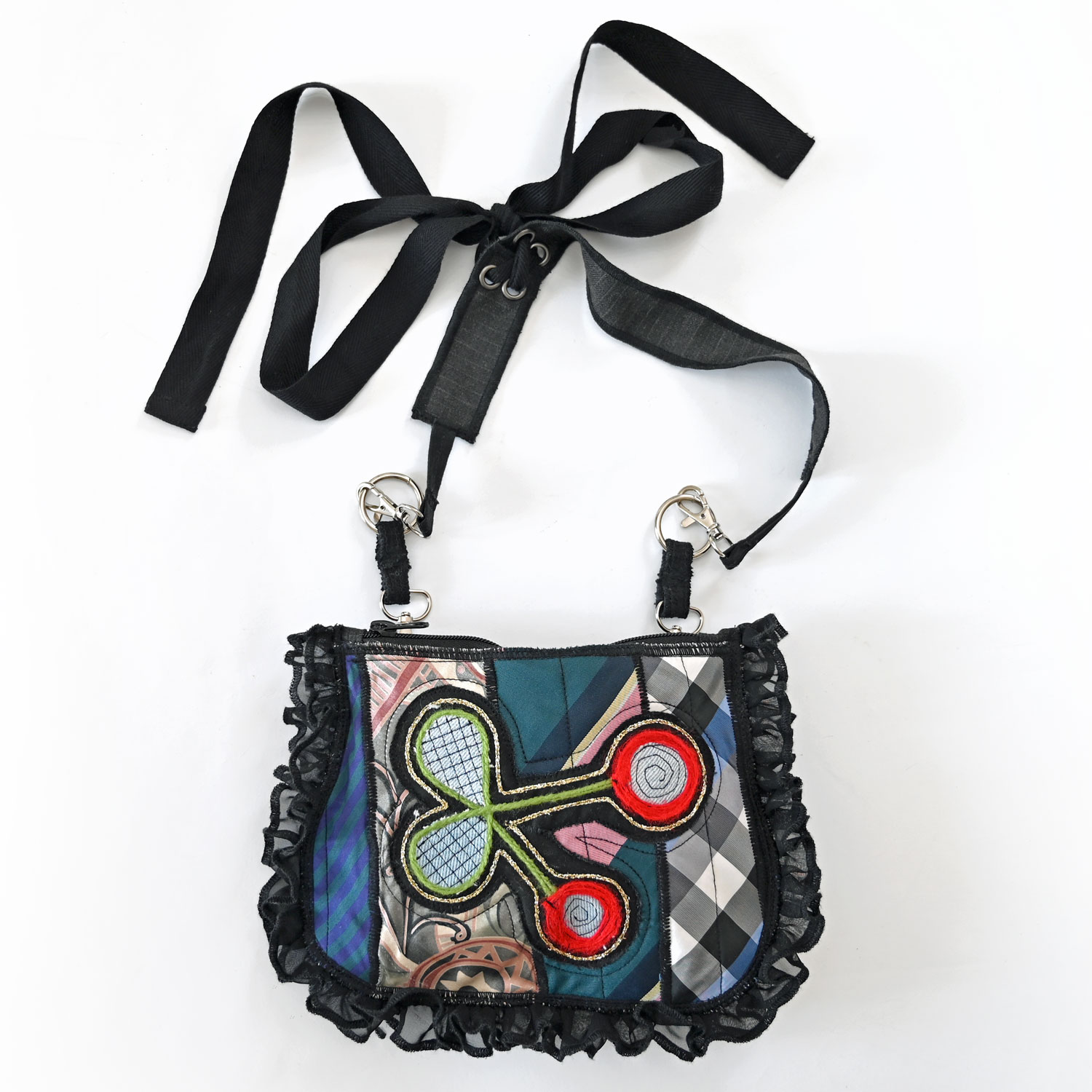 Torbica od nadcikliranih kravata i drugih tkanina, s nestašnim volanom naokolo.