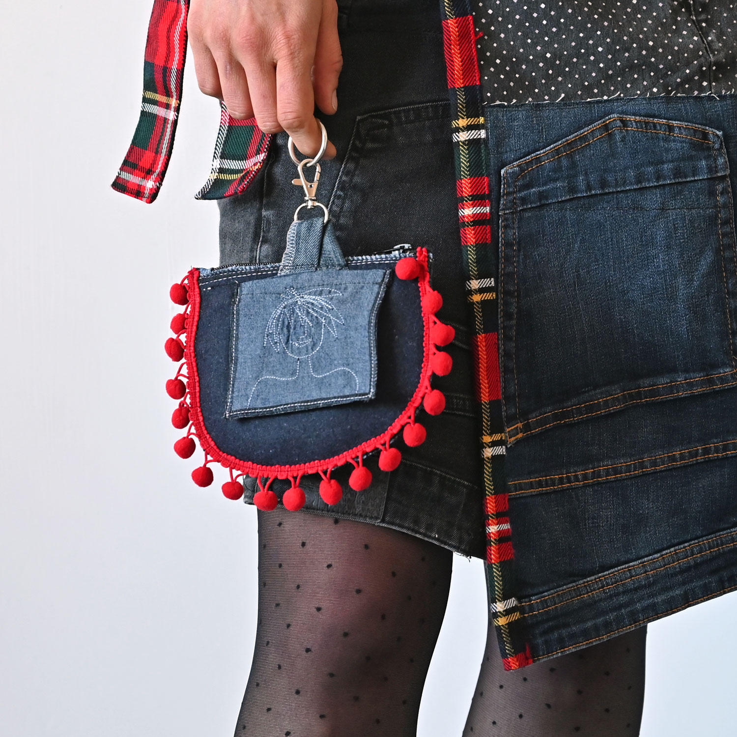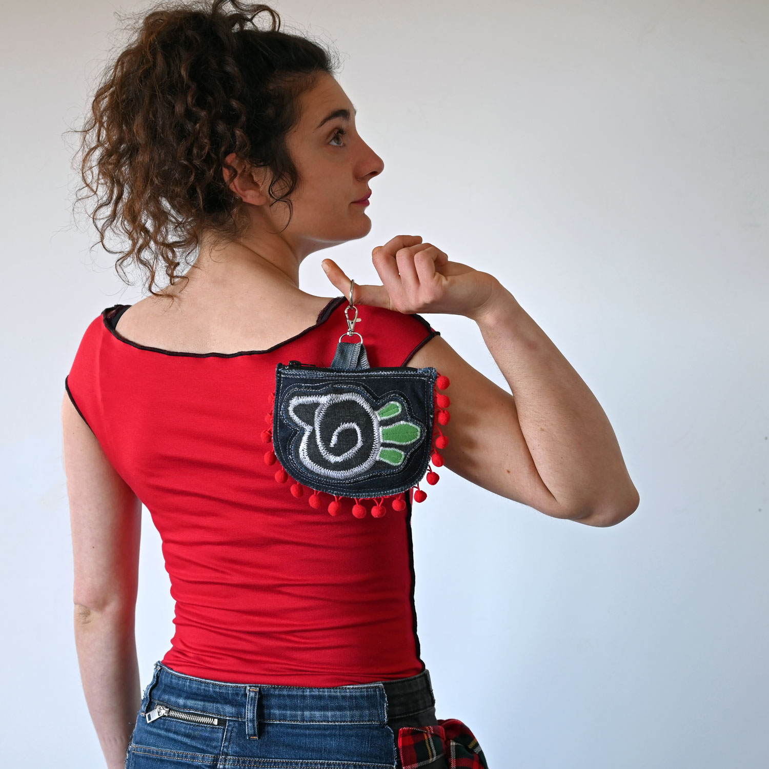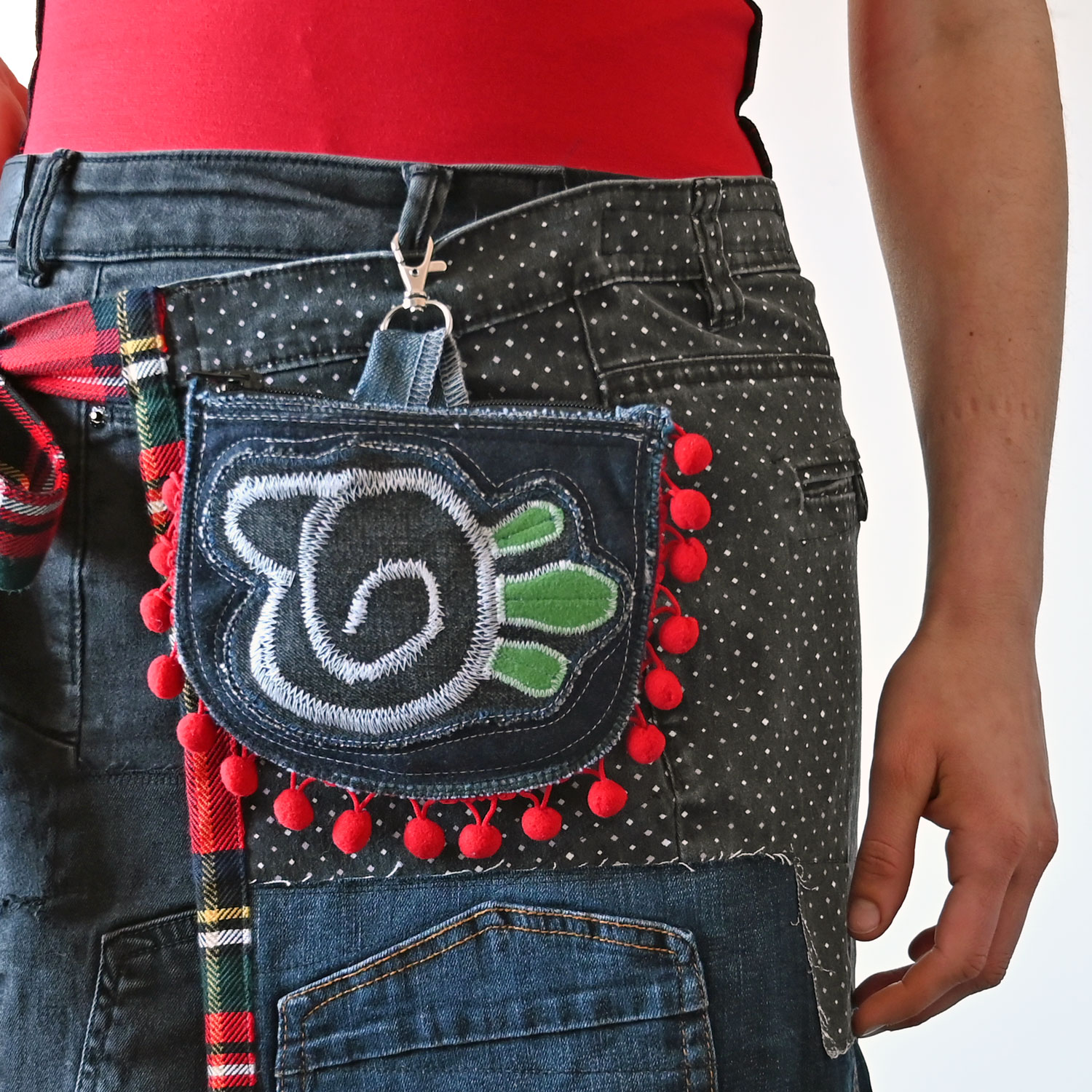 Torbica dimenzija 17 x 14 cm, od recikliranog džinsa i drugih tkanina. Na leđima je džepić.