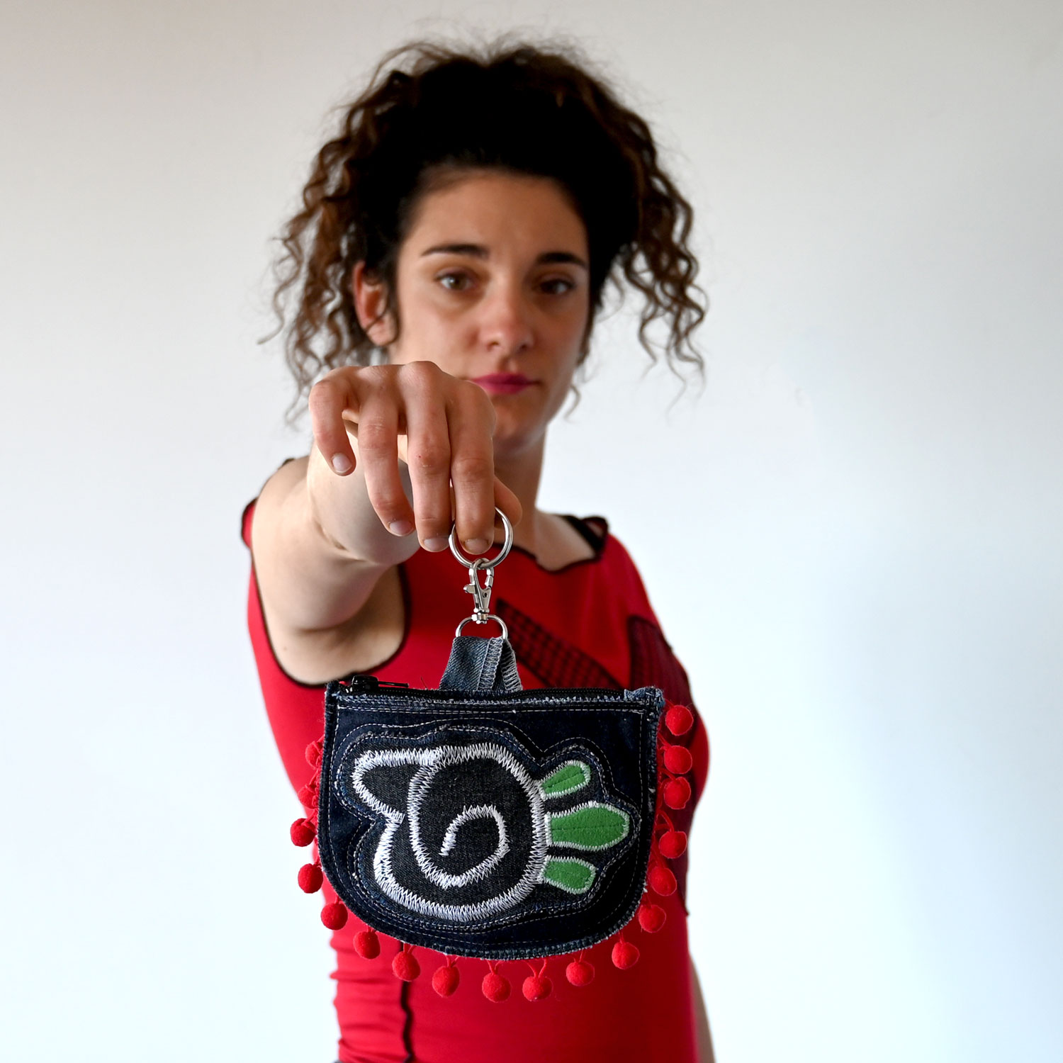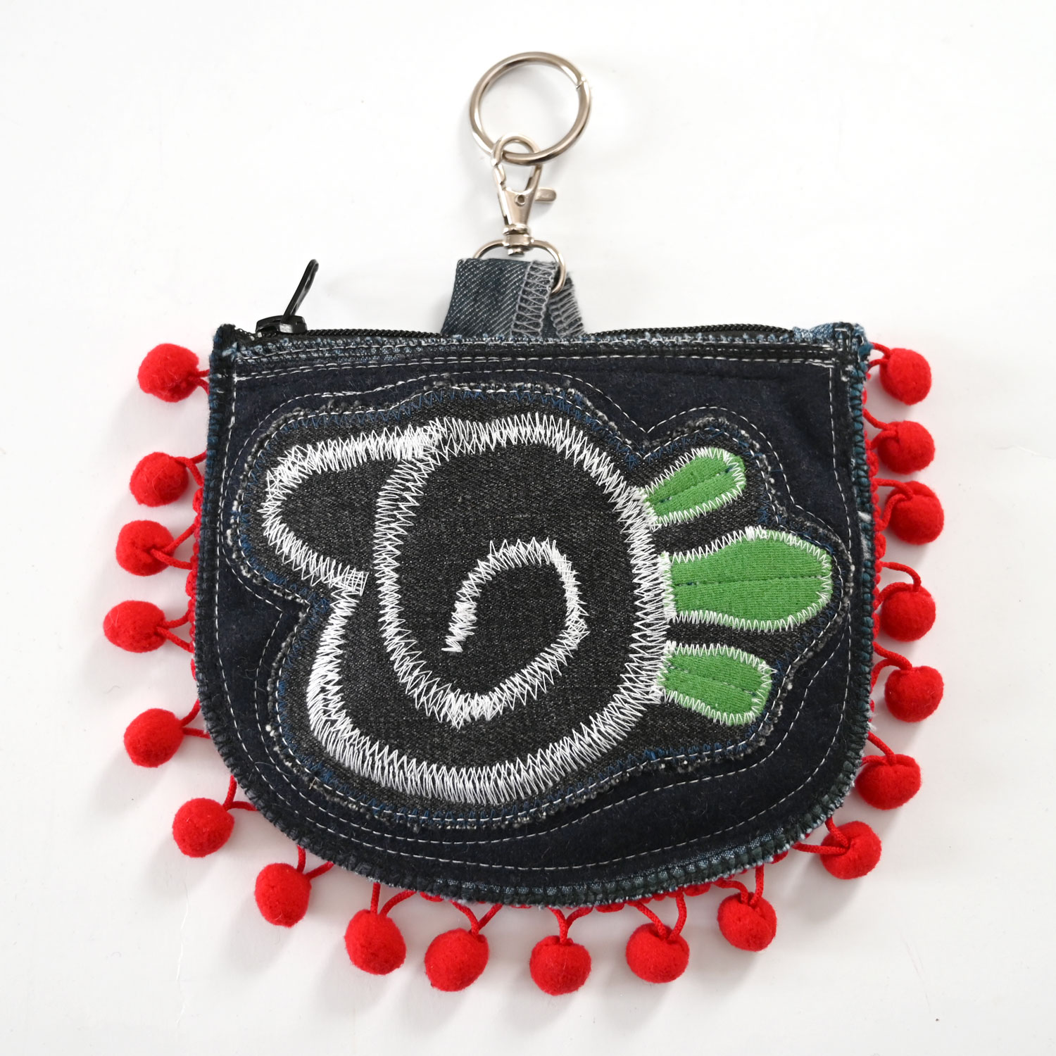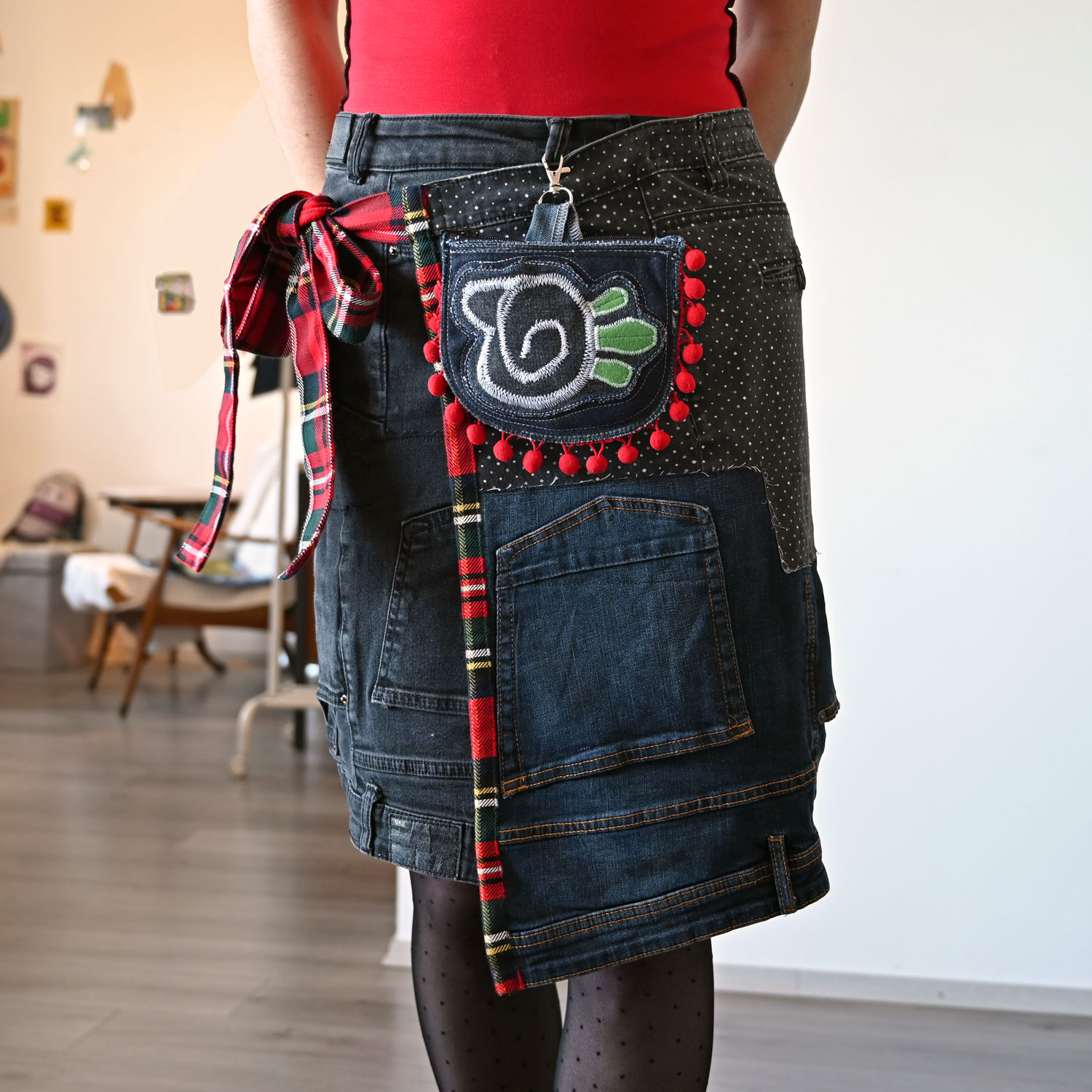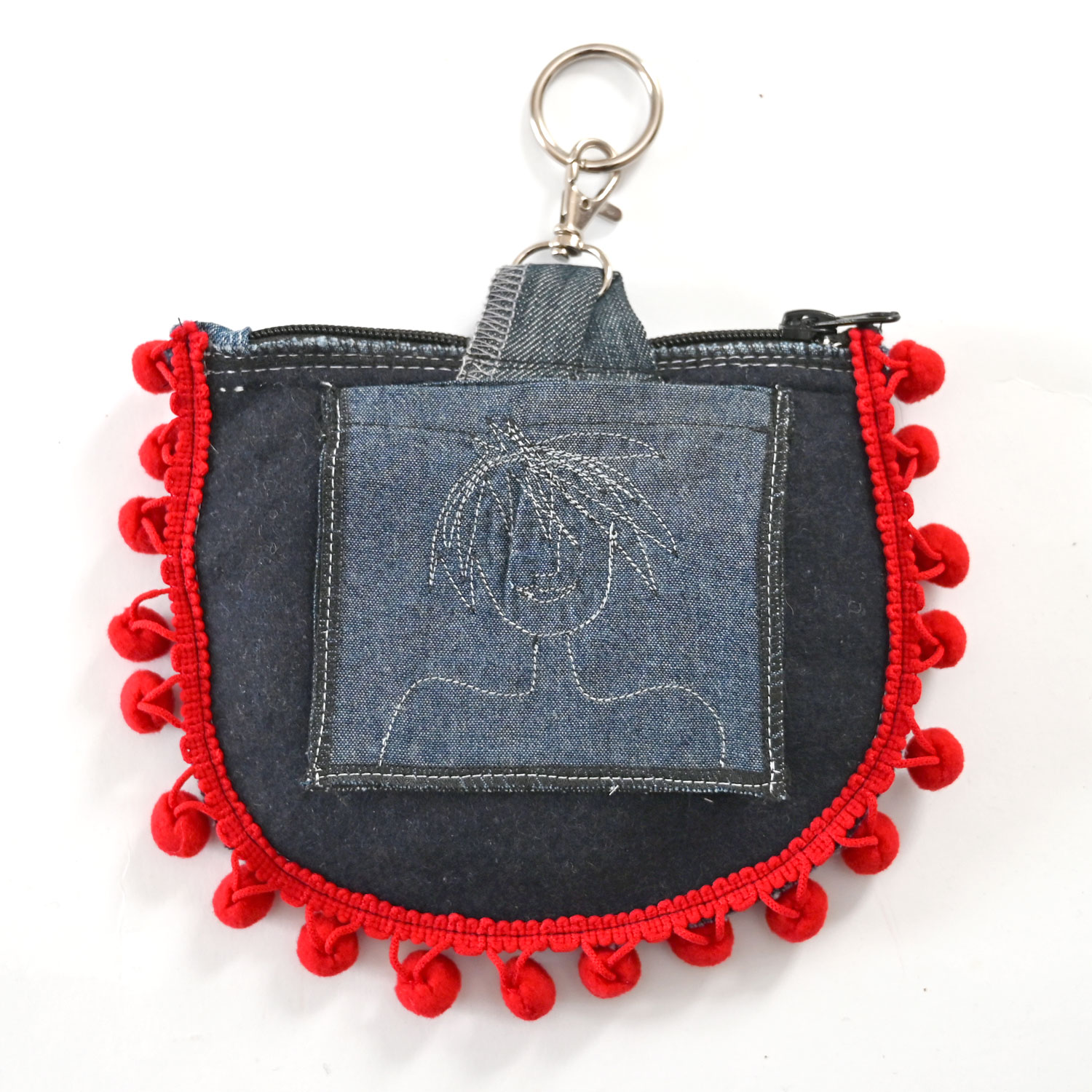 Torbica dimenzija 17 x 14 cm, od recikliranog džinsa i drugih tkanina. Na leđima je džepić.